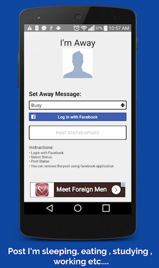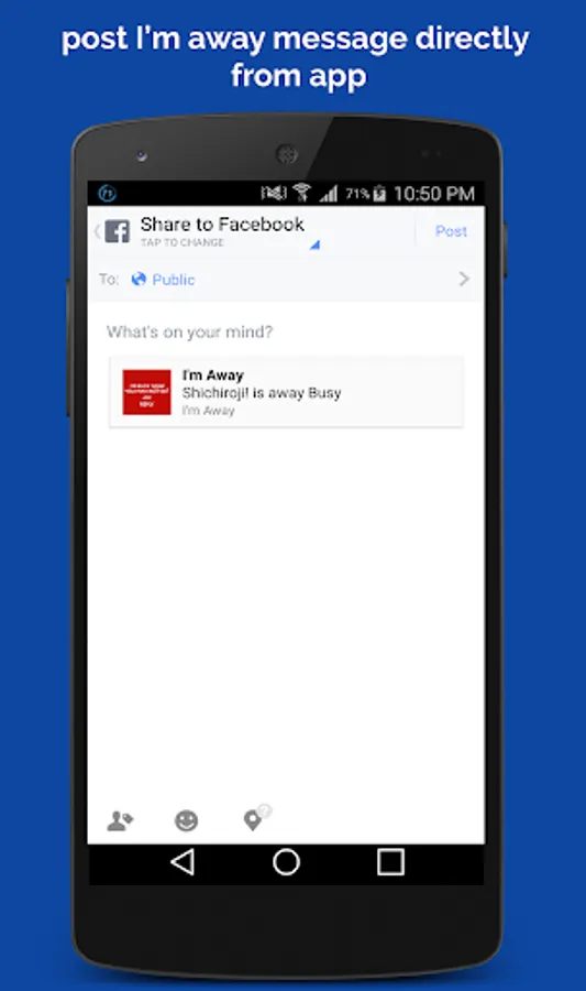 Have you ever logged into your facebook account to alot of messages from your friends asking where have you been. If you are getting tried of this and want this problem to end, well theres an app for that. Introducing I’M AWAY is the messenger app that allows you to post I'm Away messages to your Facebook account without logging in to do so, messages like; I'm away eating, sleeping,busy, driving,working and etc... So get to posting to let know Facebook followers know that I'm Away !!!