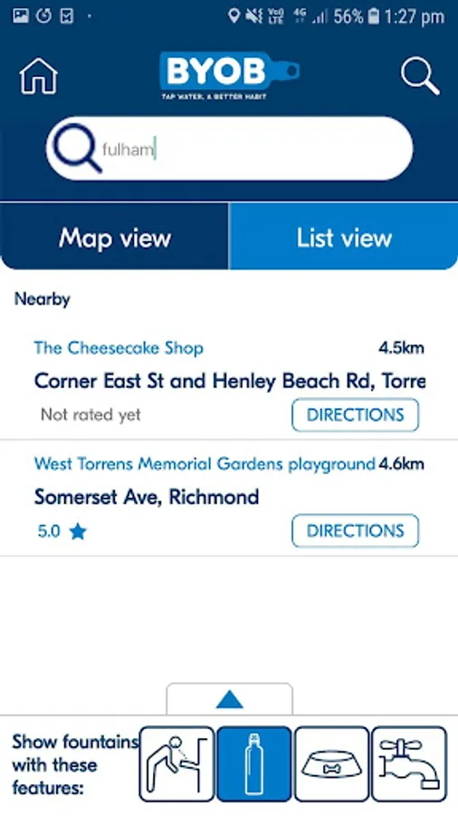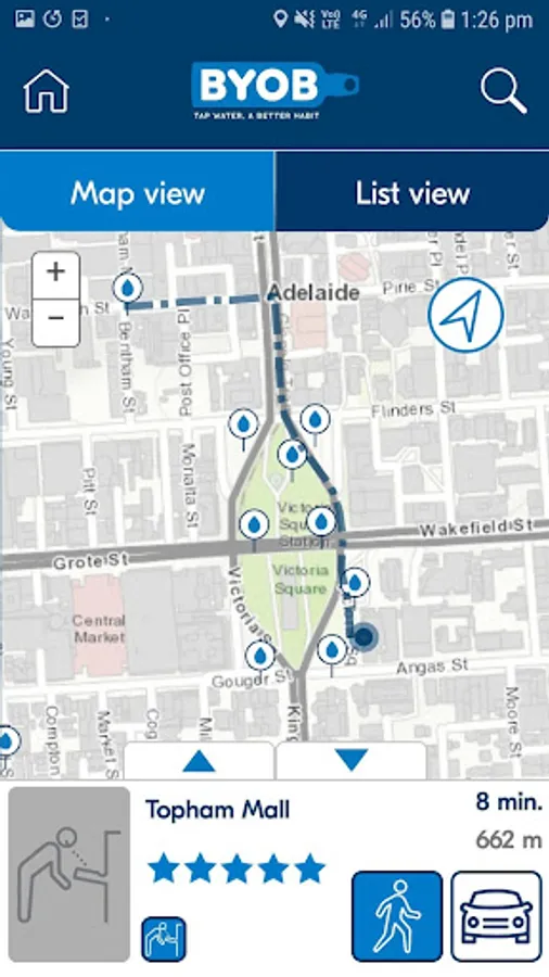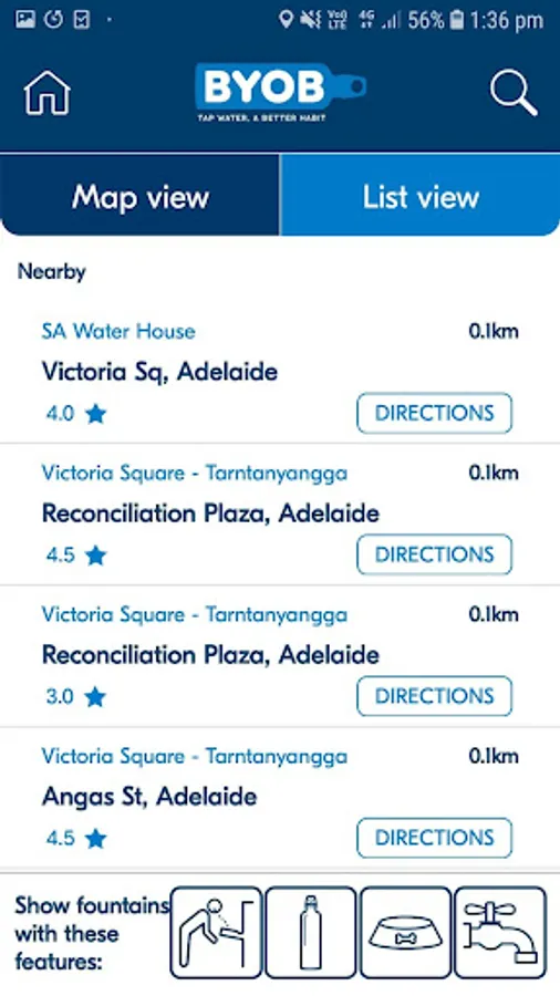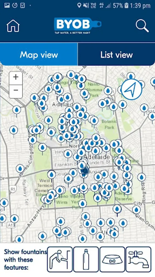 Tap water is one of the best choices you can make for your health, your wallet and the environment. SA Water’s BYOB (Bring Your Own Bottle) app enables you to search for nearby drinking fountains and bottle filling stations wherever you are in South Australia. Whether you need a quick drink, to fill your bottle, or quench your dog’s thirst, the app will help you find the fountain you need – and get you there with clear directions via an interactive map.