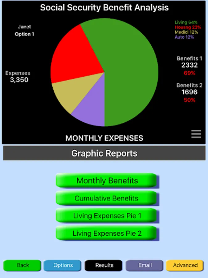 Analysis with Boss is quick and simple. All you need for an essential analysis is a birth date and the benefit amount at full retirement age (FRA). The Social Security Administration provides the FRA amount to social security payers periodically. With these two data items entered you are ready to analyze. Pick an eligible month and year to view benefit details. Enter different option and view the comparative results and line graphs for an easier grasp of projected results. This simple exercise can now be expanded with other factors such as the inflation rate, life expectancy, rate-of-return, expenses and tax related information.