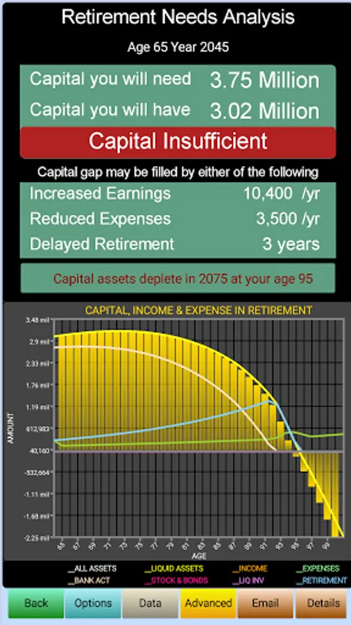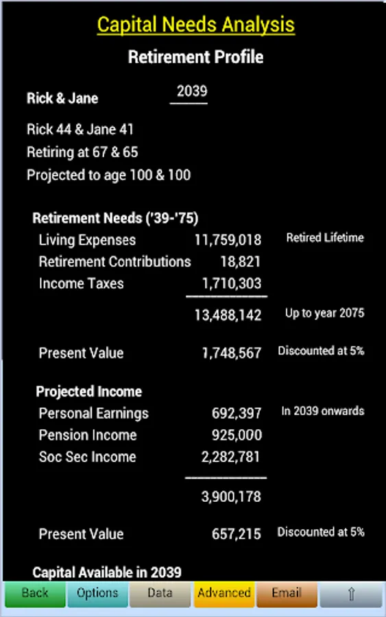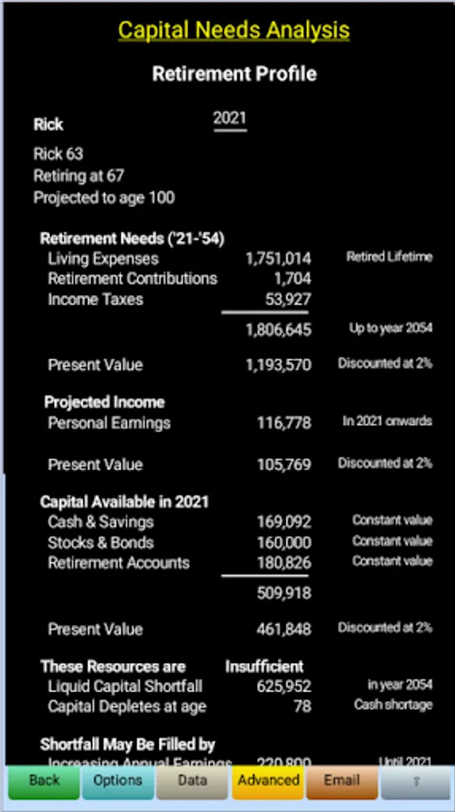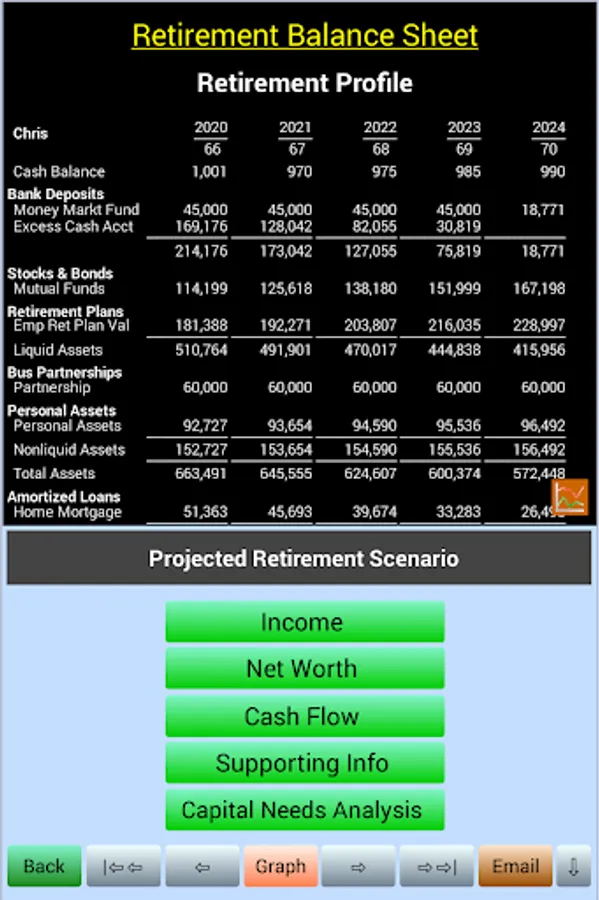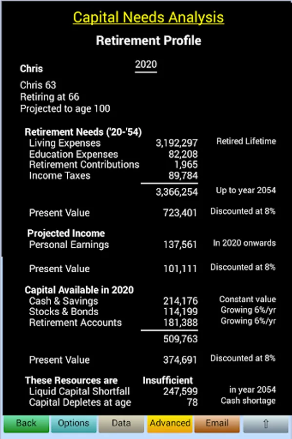 A complete set of financial statements is available for each scenario. PlanMode provides you with comprehensive analysis of retirement and other scenarios for lifetime capital needs and the capital available for its fulfillment. When capital resources are not sufficient PlanMode provides suggestive courses of action that may fill the shortcoming. The following reports are available for each profile scenario-