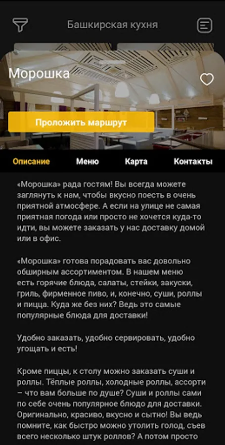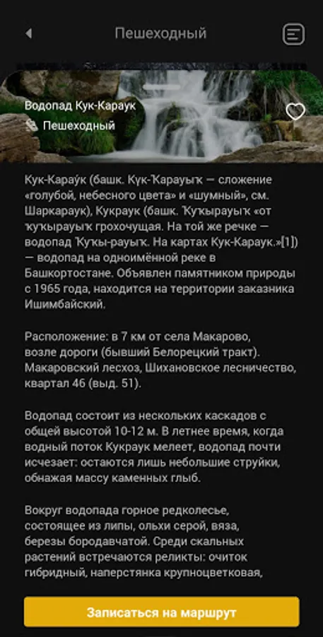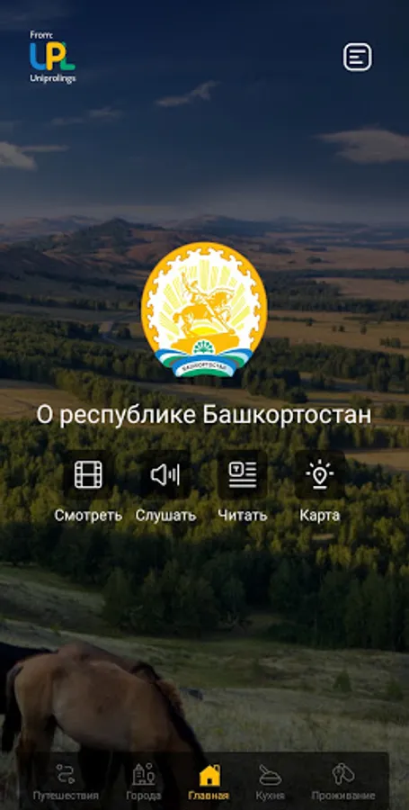 Mobile application “Terra Bashkiria” is a centralized mobile navigation service for travel and tourism in the Republic of Bashkortostan. The appendix presents the sights of Bashkortostan, tourist routes, as well as national cuisine. The user of the application can choose the type of tourism (hiking, skiing, mountain, water, cycling, health, cultural and educational, professional and business, sports, religious, etc.) to build a route or use the services of accredited travel operators.