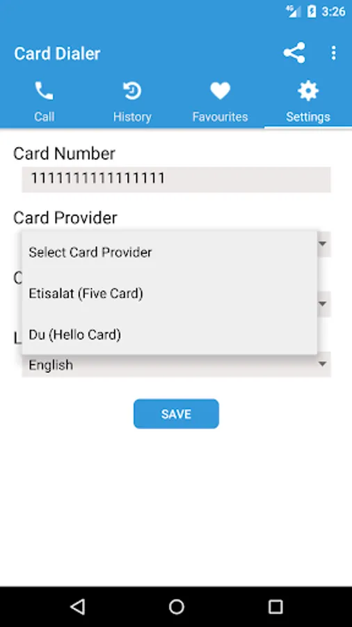 - Settings Screen: select Etisalat or Du ,Card Pin Number, Language Selection , Country selection.
