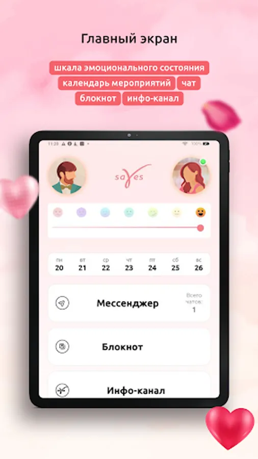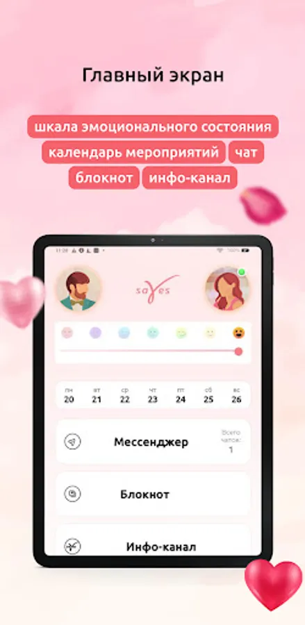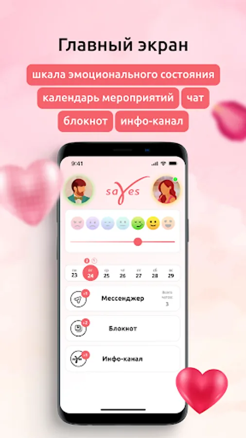 Sayes is a simple communication app for couples. This is a common space, the main theme of which is intimate relationships. As a result of non-verbal, formal and informal forms of communication between partners, there is a weakening of psychological barriers that limit the release of hidden feelings, emotions and needs. There is a conscious desire and the opportunity to develop, communicate, coordinate, plan, and strive for a sustainable system of relationships.