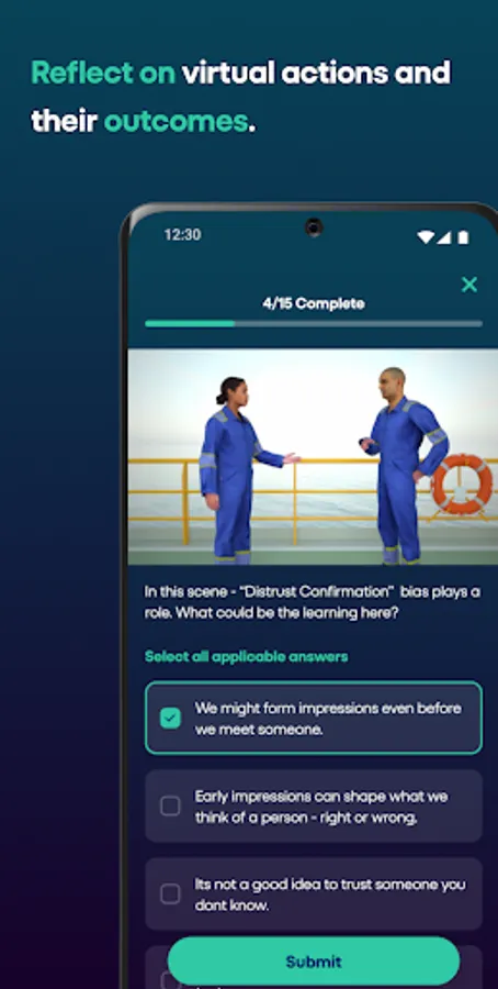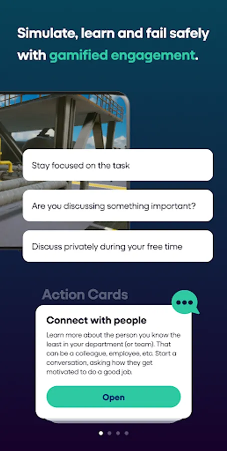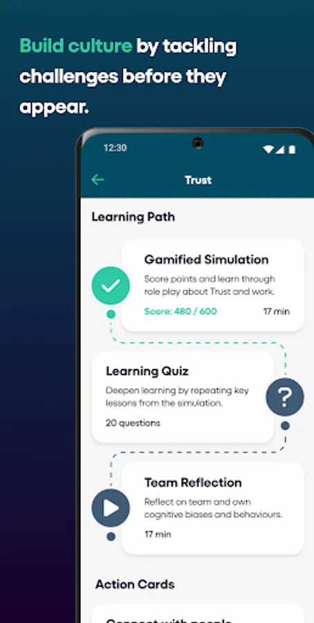 Through realistic role-playing simulations and quizzes, team members can individually practice and learn these cultural habits and behaviors. The app also enables a team member to act as a facilitator, using the app to guide team reflections and choose pre-defined action cards for implementing what they've learned in real-life situations. Gamification elements like scores and badges are incorporated to increase engagement and motivate success in the transformation process.
