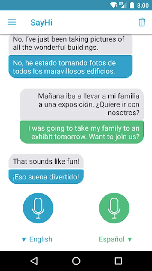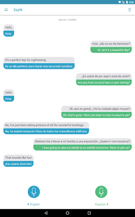 Instantly speak another language, for free, with SayHi Translate on Android! Have a conversation in two languages and hear your voice translated instantly.