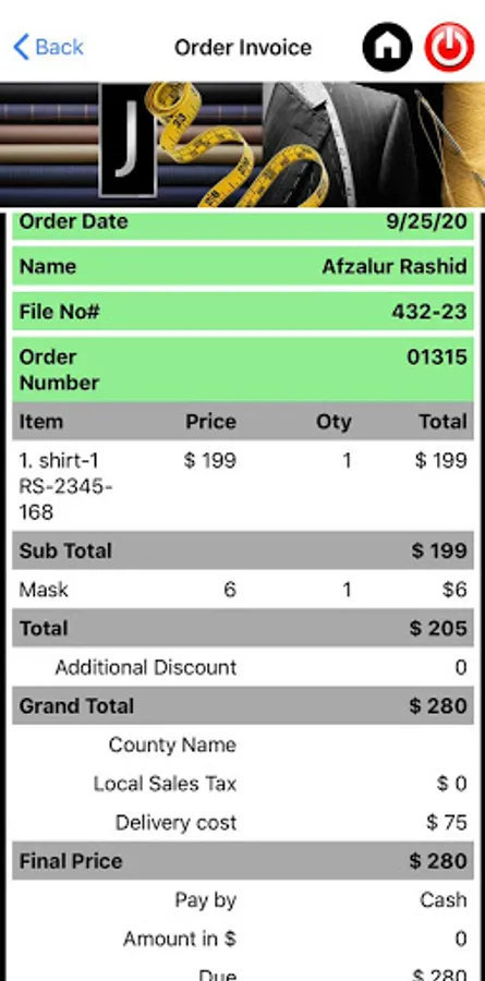 This app covers all the activities related to the order received from customer. It has features for Sales Representative to take order, input measurement. Master tailor will be able to check order, measurement and template to approve the order. Once the order is approved then production agent can receive, make and send to head quarter. Shipping staff then receives the product and send to customer through courier.