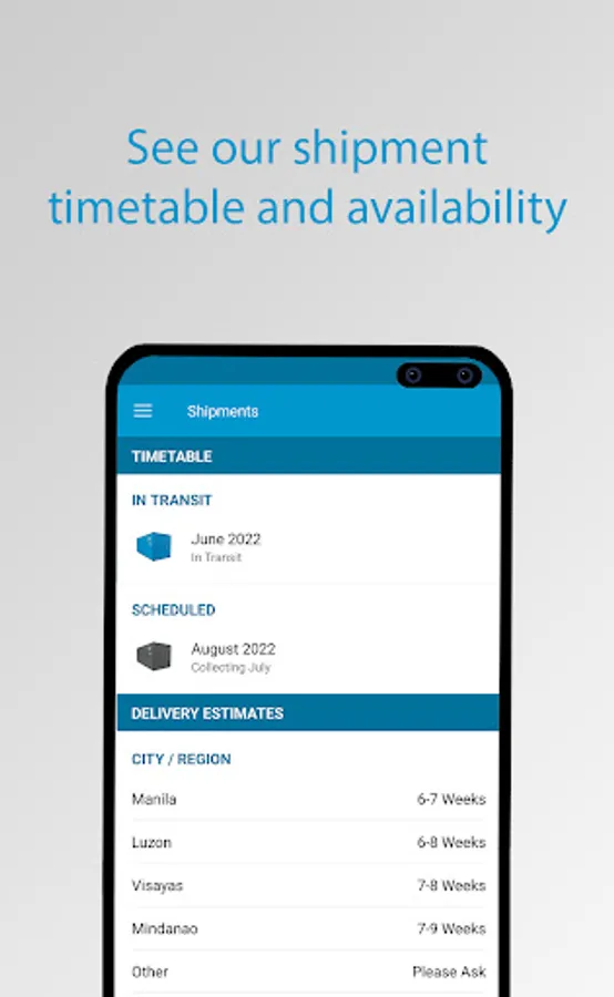 All customers will receive a tracking ID which can then be viewed using this app. The app will also show our upcoming shipment schedule.