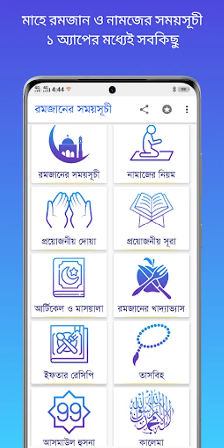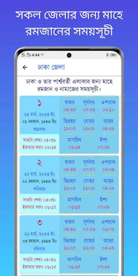 Ramadan Bangla Calendar 2023. This app of ours is made with the latest schedule of all districts of Ramadan. In Ramadan Calendar 2023 app, you can see Sehri, Fajr and Iftar and Namaz schedule of the holy month of Ramadan along with some important acts of the month of Ramadan. Which is very beneficial for all of us. May Ramadan 2023 bring us a blessed month. May Ramadhan 2023 be the month of atonement for our sins. May the sanctity of Ramadan spread to everyone.