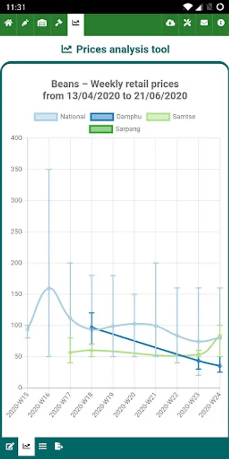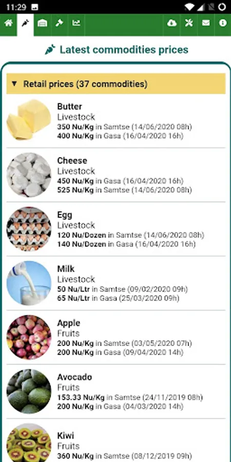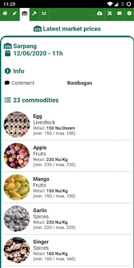 Commodity prices are collected weekly in average on 23 markets accross Bhutan, and the AMIS also hosts also commodity prices of 4 auction markets, where information is collected daily by the Food Corporation of Bhutan Limited (FCBL).