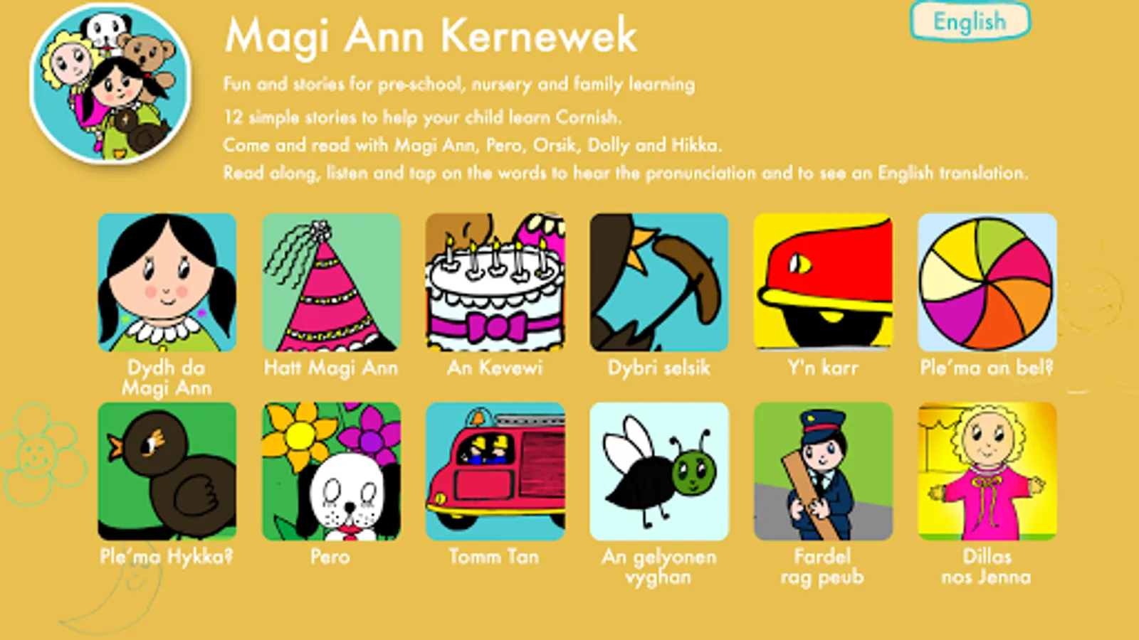 The Magi Ann stories were originally written by Mena Evans to help young children and their families learn Welsh. These stories were developed into a prize-winning app by Menter Iaith Fflint a Wrecsam. Now, Golden Tree have translated Magi Ann into Cornish to help the next generation of Cornish speakers get off to a flying start.