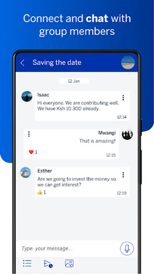 The Chama app has inbuilt, real time chat. The chat also has a polls feature which allows the group to vote on important decisions.