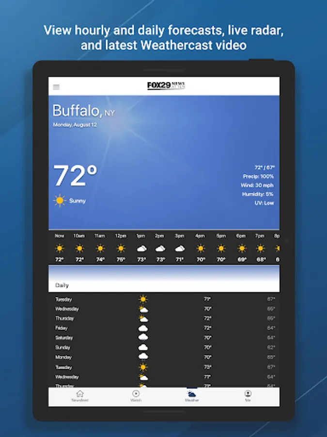 The Fox 29 WUTV of Buffalo, New York news delivers news, weather and sports in an instant. With the new and fully redesigned app you can watch live newscasts, get up-to-the minute local and national news, weather and traffic conditions and stay informed via notifications alerting you to breaking news and local events.