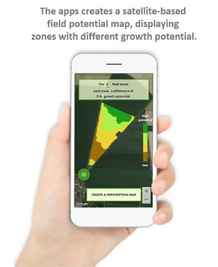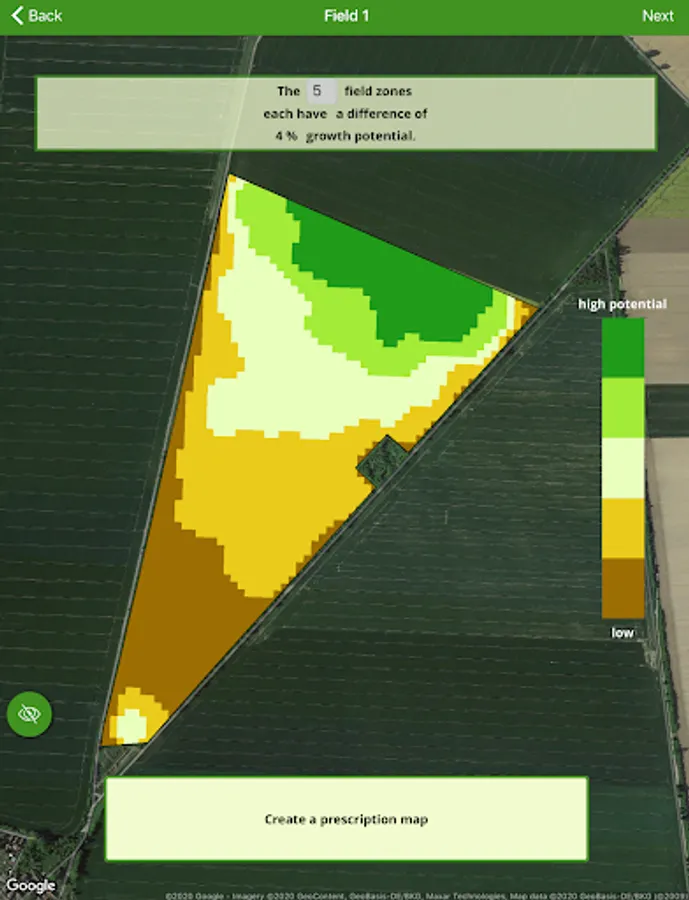 Precision Farming used to be expensive and complicated - not with Solorrow: Within seconds, the app analyses satellite images of the last 3–5 years and detects how much biomass has grown where on your field within this time period. Based on this, an individual field map is created which shows zones with different potential zones. You can even see how strong the growth potential differs between the zones.