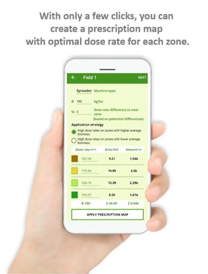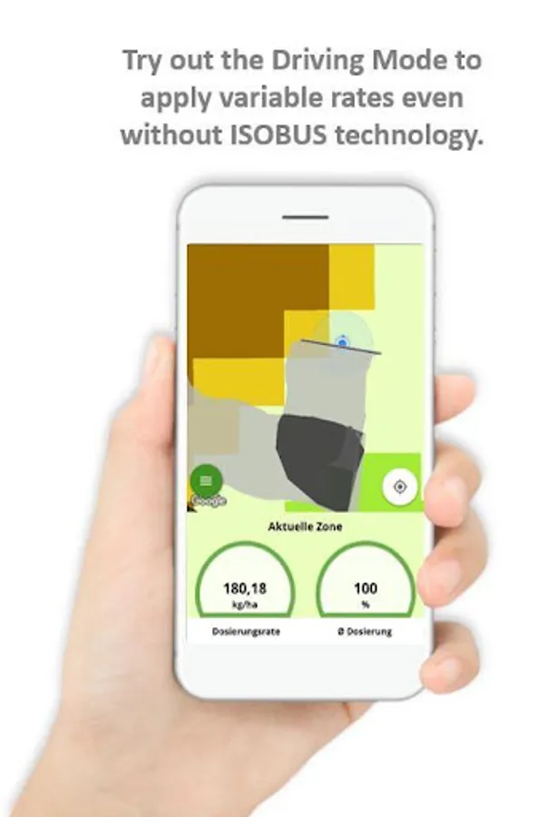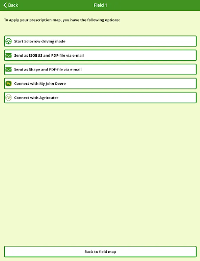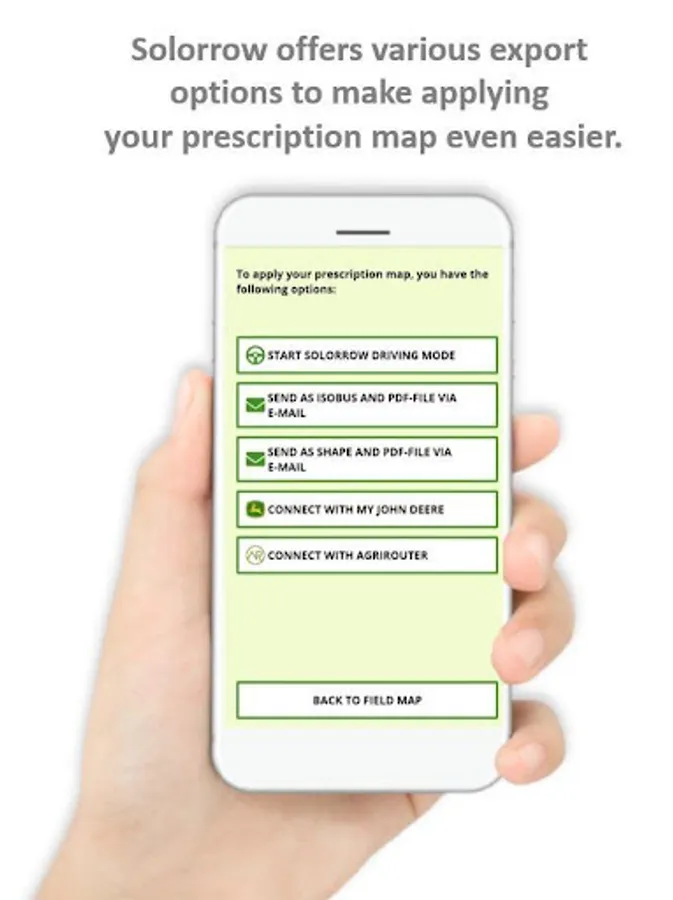 Now on to the application: You can either add a manual dose rate for each field zone or let Solorrow suggest an optimized dose rate based on the zone potential differences. You can export this individual prescription map as ISOBUS- and Shape-file via E-Mail and additionally receive a PDF-file with an overview of your prescription map which you can open at your desktop PC and even print. You want to start right away? Try the innovative Solorrow driving mode and your mobile device turns into a machine terminal. With Solorrow. every field zone is treated optimally and fertilization becomes more precise and efficient.