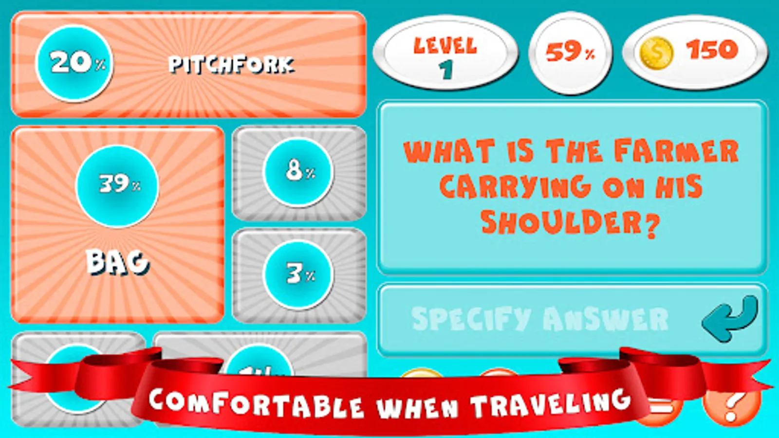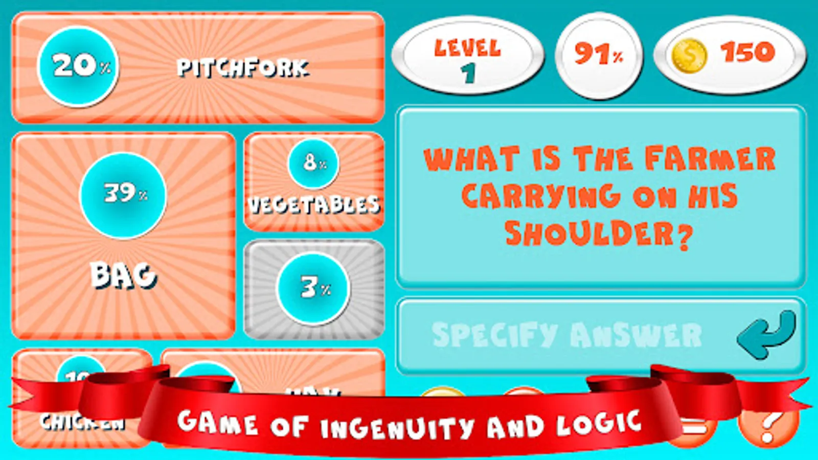 Quiz without internet 94 percent contains many exciting levels. For all questions, you need to try to enter the answers that other users have entered. For example, you have a question: "An object in the bathroom" - the answers will be: toothbrush, towel, soap, shampoo, etc. That is, you need to enter not the correct answer, but what other people think. Each word has its own percentage, your task is to score the required number of points for the level, then it will be considered passed. 90 percent do not allow you to open another level. In logical association games, 94 percent of the answers are not unambiguous, so you need good imagination, logic and ingenuity. The player always has access to 5 open levels, when passing one of them, another level becomes available to him. At the beginning of the game, starting 150 game coins are given to mind, when passing one level, you can still earn from 50 to 120 coins. There are hints in online intellectual games that you can use at any time. You can open the answer for game coins, or for watching ads.