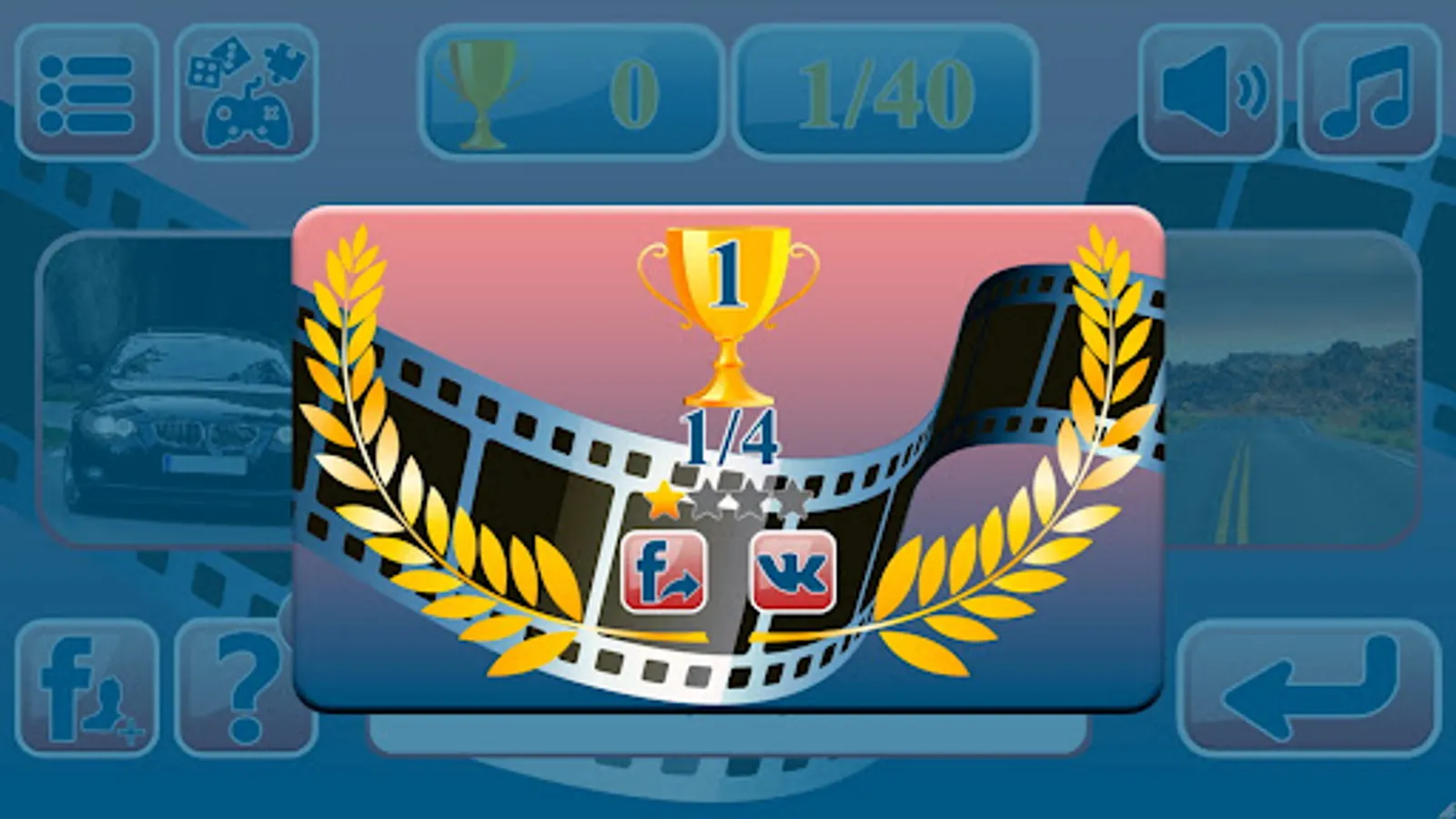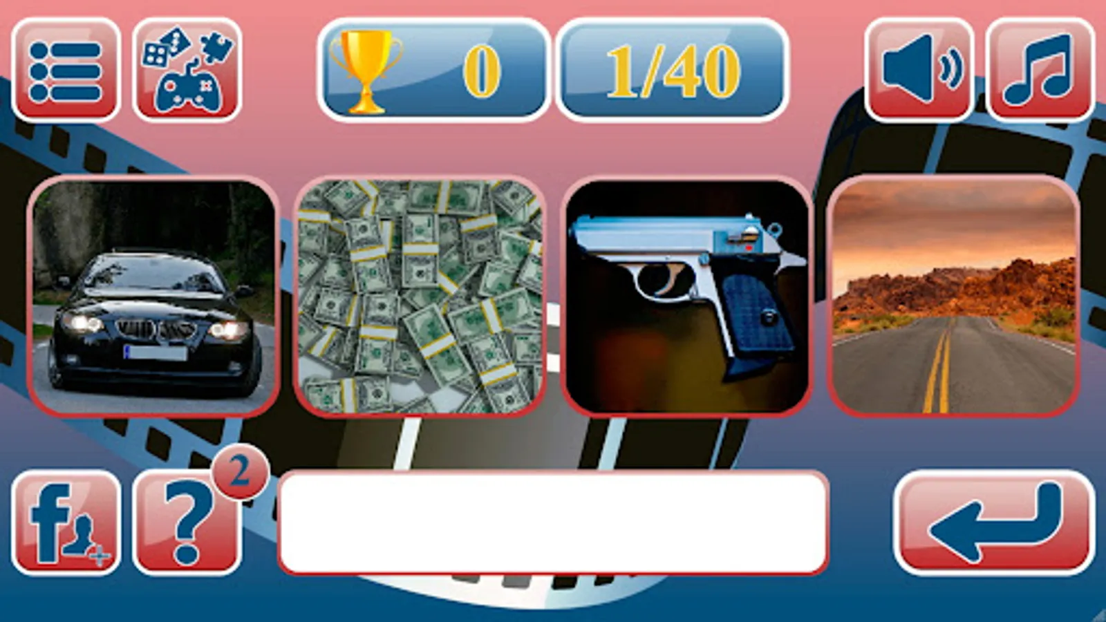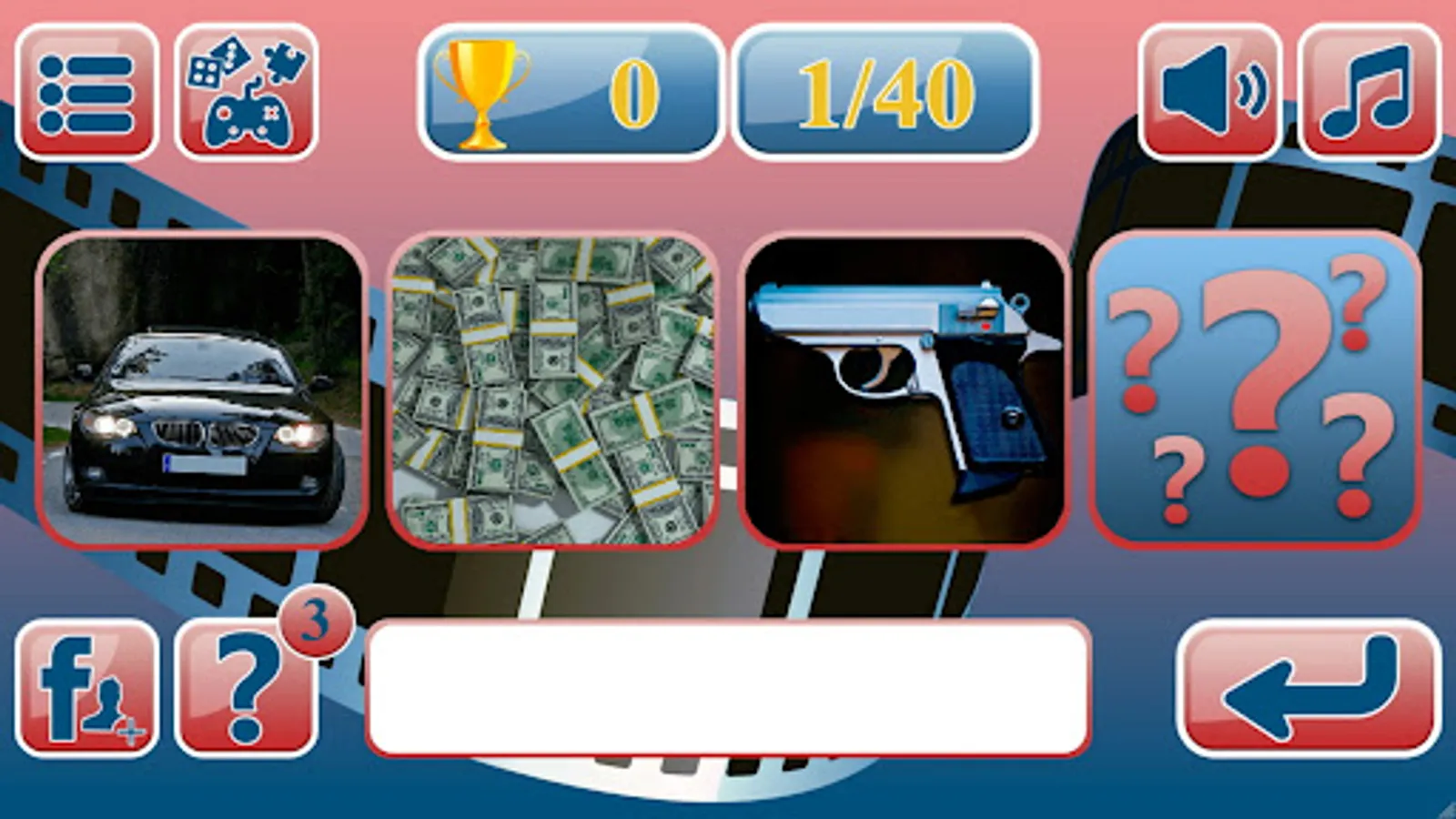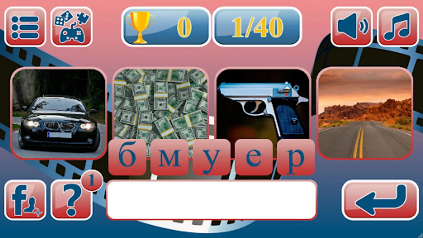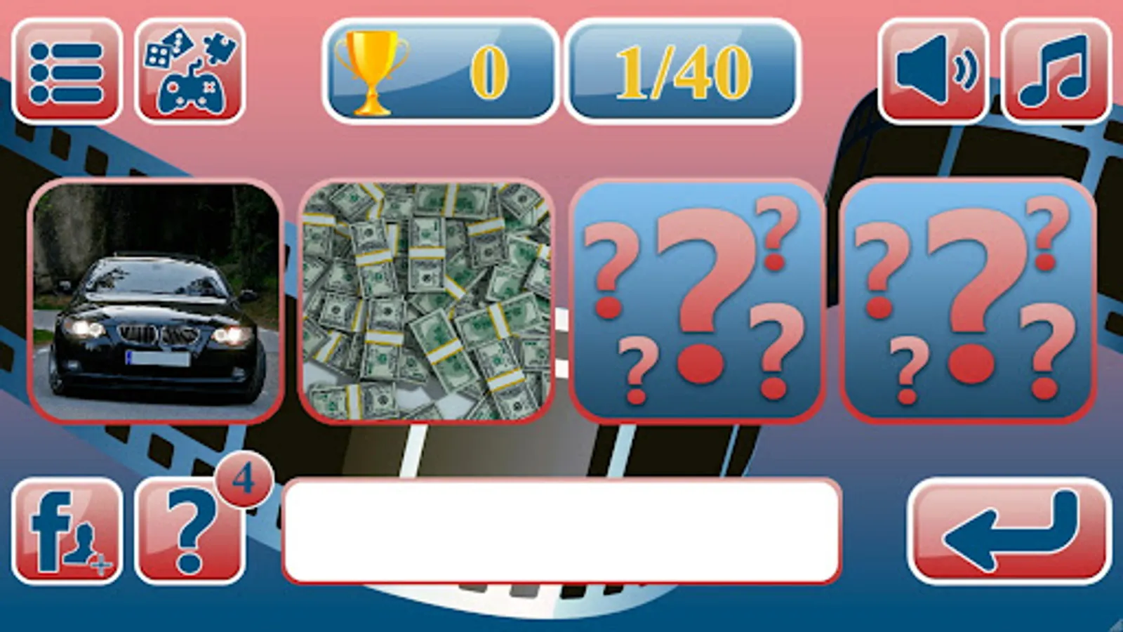 The game consists of 50 interesting levels. In each level, 4 images are displayed on the screen: 2 open images and 2 closed ones. If it is clear from two pictures what kind of movie it is, he can enter the title in the answer field and receive 4 points for the correct answer. If two images are not enough, you can click on the hint button and a 3 picture will open, so the player can earn 3 points. When you click on the hint again, 4 picture opens, and the player earns 2 points. If you can't guess the film from 4 images, then you can use the cheat sheet button twice more, then you can see a set of letters that make up the word answer. But with each click on the hint, the player loses another point. At the end of the game, you will be able to see the total points earned.