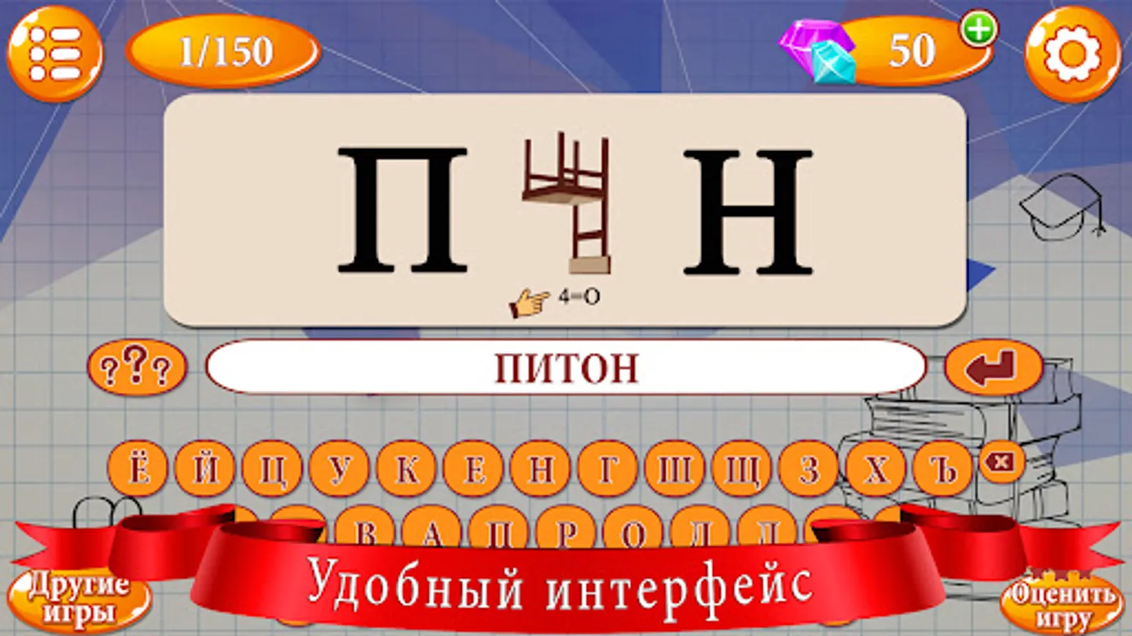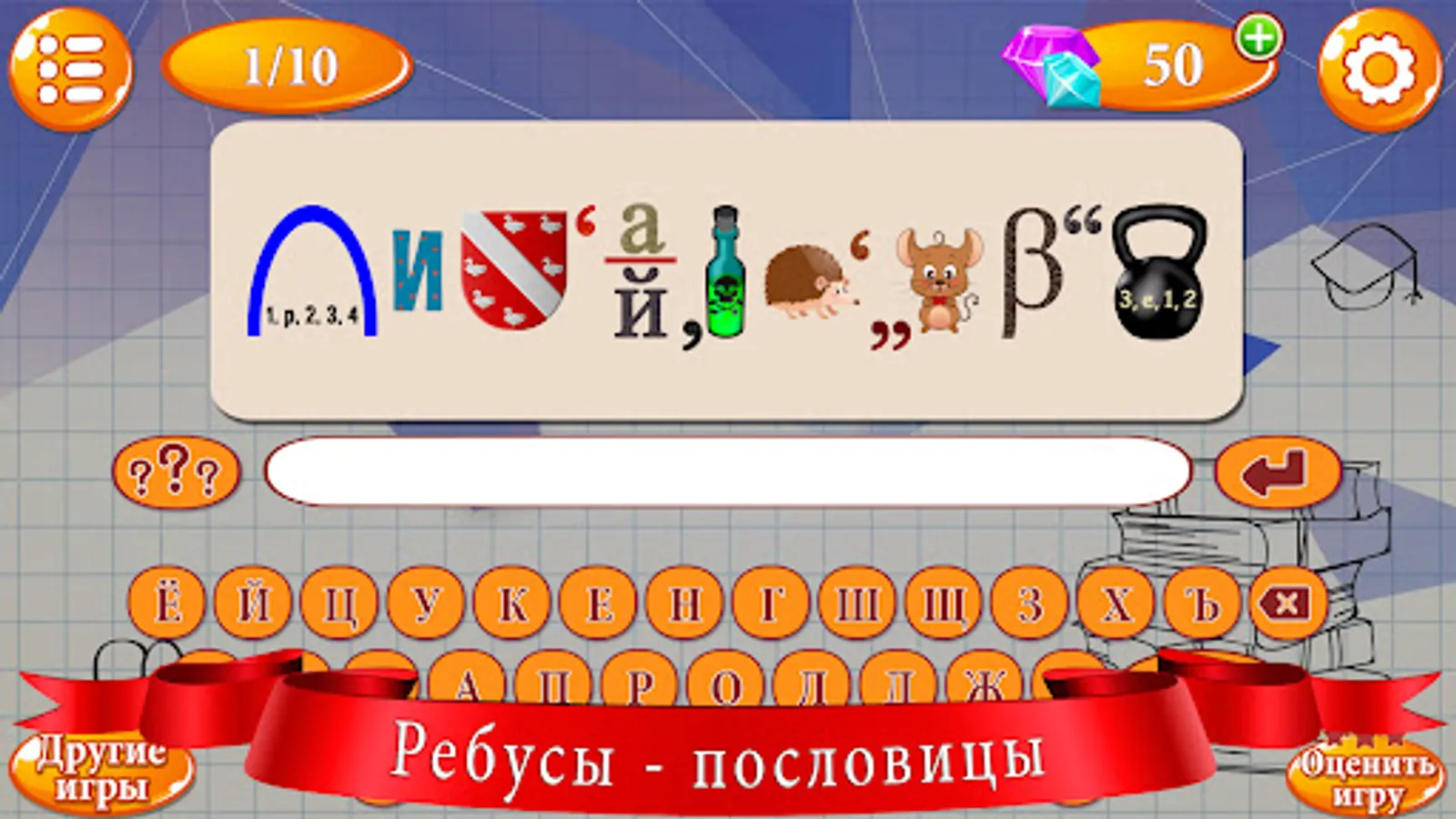 In the game smart puzzle rebus you have to go through many different levels in which you need to solve complex logic problems. The gameplay is accompanied by pleasant music and sound effects that can be turned off if desired. If you have problems finding the solution to the puzzle, you can use the hint by clicking on the button with question marks.