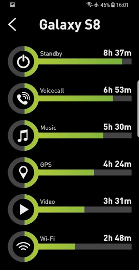 And that's not all. Once your smartphone is charging the app provides you with useful information, such as how much time it will take for the battery to be fully charged. In the details screen you can even see how long the battery will last depending on whether the device is being used for calling, listening to music and videos, using GPS and Wi-Fi or gaming.