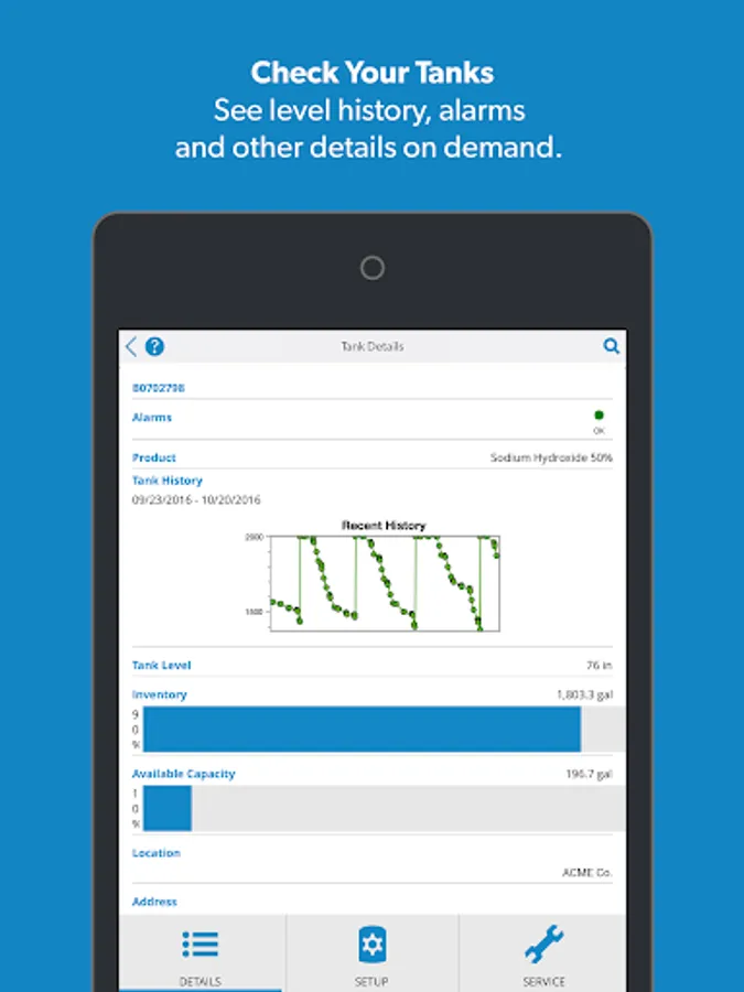 SMARTank by SkyBitz is a free app that gives system users total visibility into, and control over, their storage tanks. It gives users the ability to know tank level, temperature, location and more 24/7, all from their mobile device. Receive notifications, alerts and alarms to criteria that you set, on time frames that you set. Chemical suppliers, distributors, operations and production managers optimize their operating efficiency through wireless tank monitoring and receive a rapid ROI based upon reduced tank servicing costs and improved inventory management.