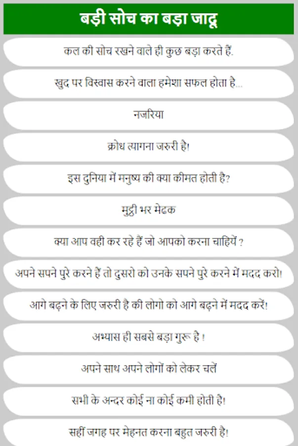 बड़ी सोच का बड़ा जादू : सफलता और खुशहाल जीवन का आधार" एंड्राइड एप्प एक प्रेरणादायक और सोच बदलने वाली कहानियों का संग्रह हैं | इस एप्प से आप अपनी सोच को बदलकर वो सबकुछ हासिल कर सकते हैं जो आप करना कहते हैं | अच्छी नौकरी, ज्यादा कमाई, प्रभावशाली व्यक्तित्व, मधुर सम्बन्ध, आर्थिक सुरक्षा, खुशहाल जीवन ये सब किसे नही चाहिए? शायद आपको भी इनमे से कुछ या सारी चीजो की चाह होगी।