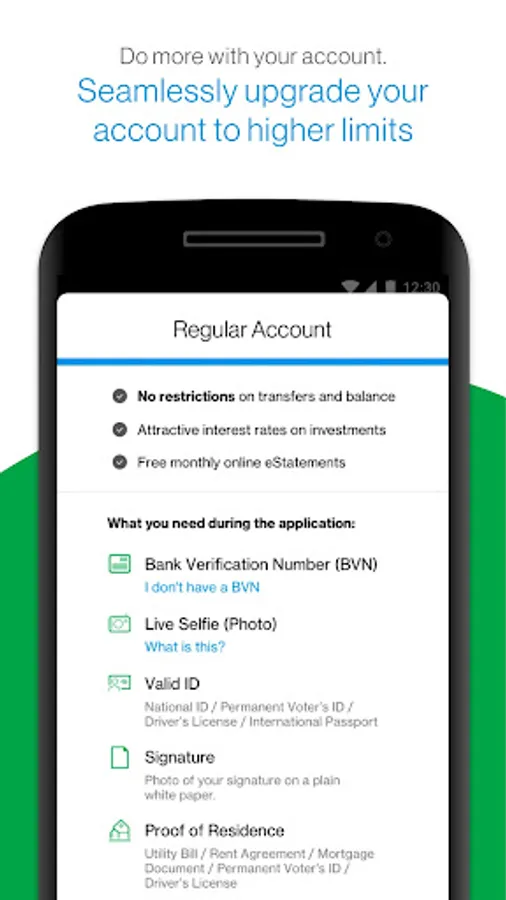 From an Instant Account, you can upgrade your account to Instant Plus, Salary or Regular Savings to do more transactions. Furthermore, you will be able to open Current Account in Naira, USD or GBP with the Bank. Option to apply for mortgage, personal loans and credit cards are coming soon.