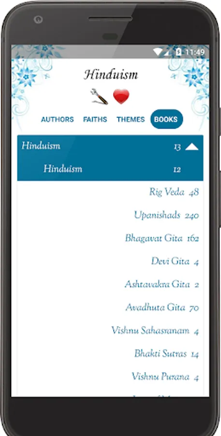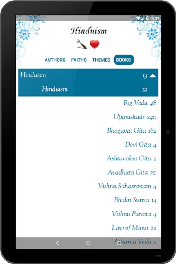 Ashtavakra Gita, Atharva Veda, Bhagavat Gita, Bhakti Sutras, Devi Gita, Mahabarata, Rig Veda, Tantric scriptures, The Law of Manu, Upanishads, etc.