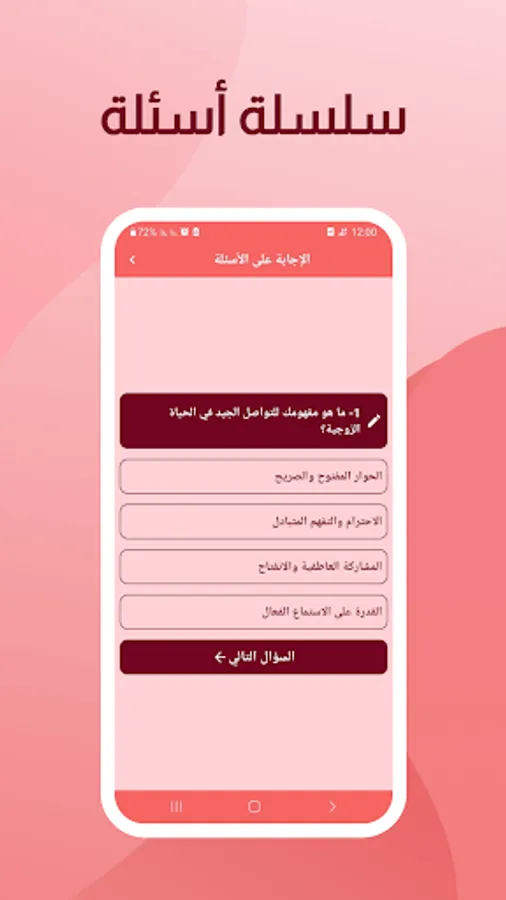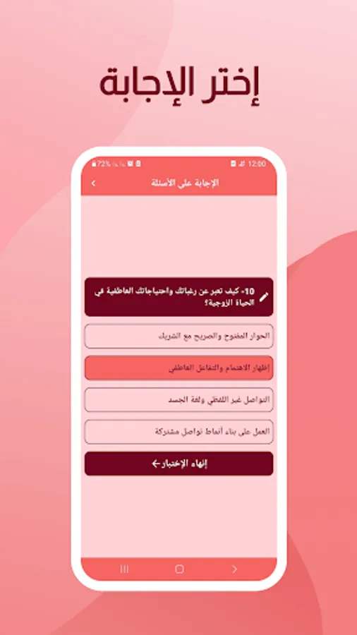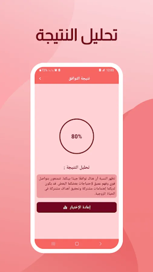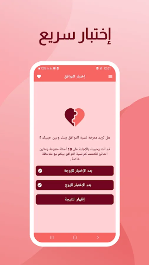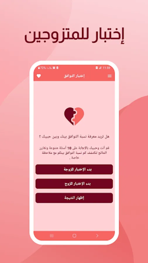 Compatibility Test App for Married Couples is an application designed to provide a test that helps couples assess the level of compatibility and communication between them. The application includes a set of questions related to marital life, goals, values, communication and understanding. The application analyzes the answers of the couples and provides a compatibility result that shows the degree of compatibility between them. This application contributes to enhancing mutual understanding and enhancing communication between couples.