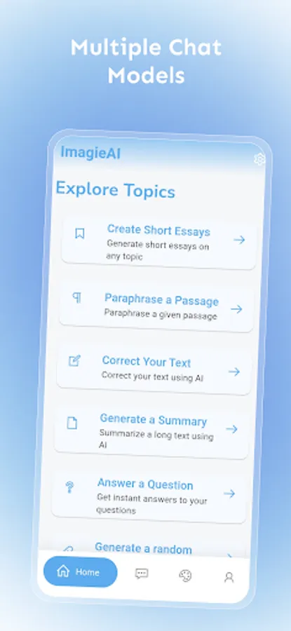Turn words into photos & beautiful digital artworks using the power of AI! All you need to do is enter a prompt, pick an art style - and watch ImagieAI - AI Art Generator bring your idea to life in seconds. AI Chat is a revolutionary ImagieAI powered by ChatGPT & GPT-4, GPT-3.