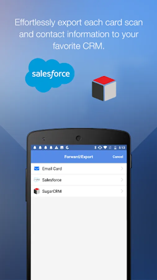 Export business card to CRM: Are you a sales person utilizing CRM (customer-relationship management) software? We've got you covered there as well. ScanBizCards can export cards to CRM platforms like Salesforce and SugarCRM!