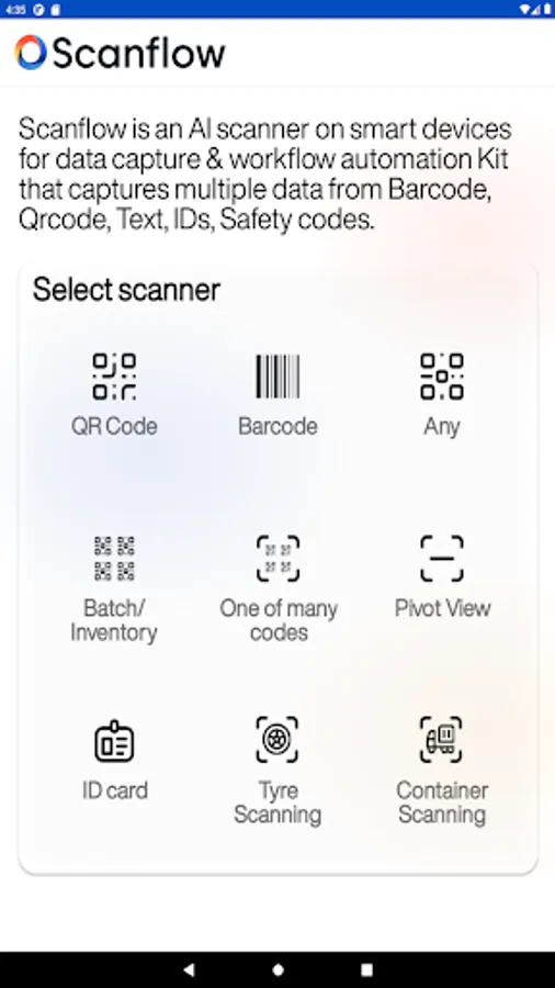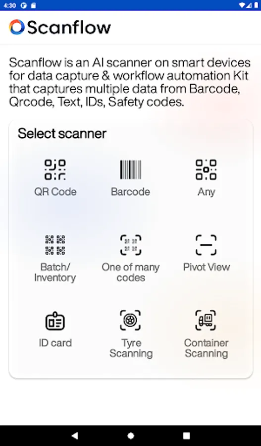 Scanflow Smartphone Scanner to scan QR/Barcode from mobile app edge detection and decode. No required Internet.