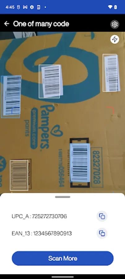 * Ability to scan Barcode / QRCode (Any Code) in the same camera view and support to scan for specific to by enabling simple flag.