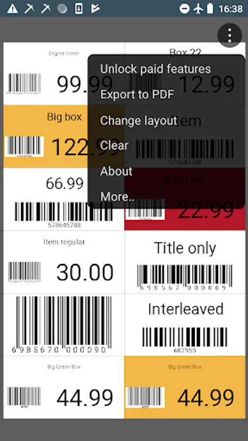 With Barcode Generator you can generate 1 A4 page with product labels and export it as PDF file for print.