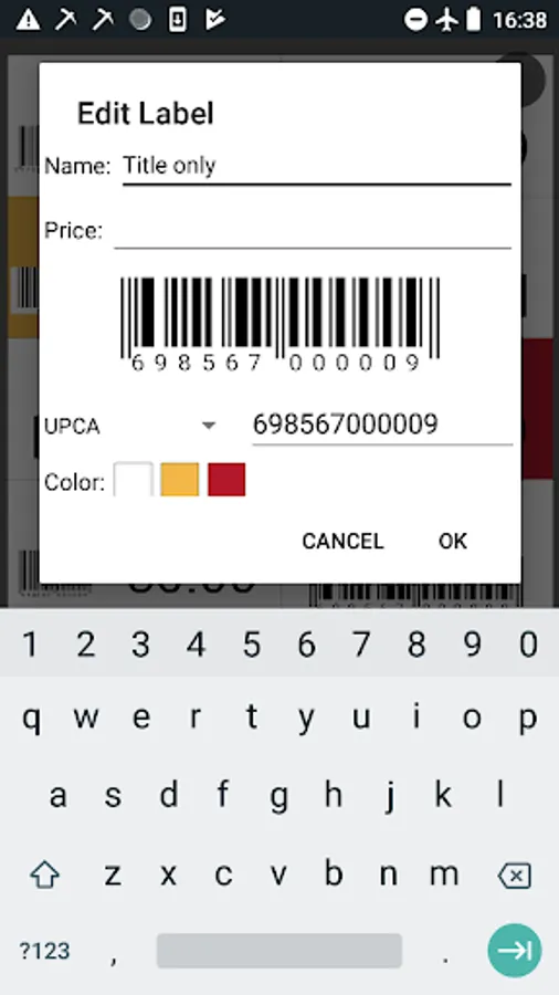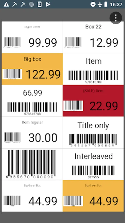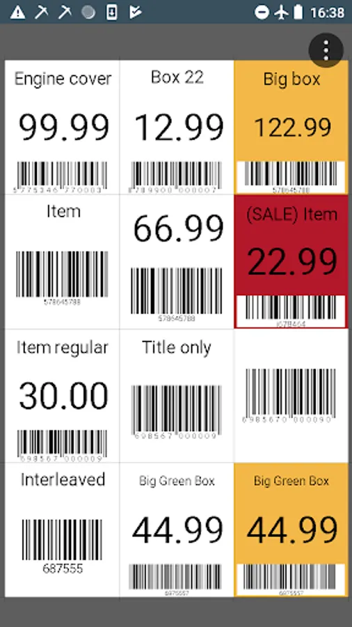 Every label can have product title, product price and barcode or any of these. There 2 page layouts.