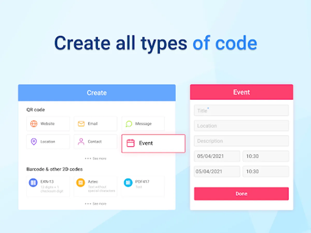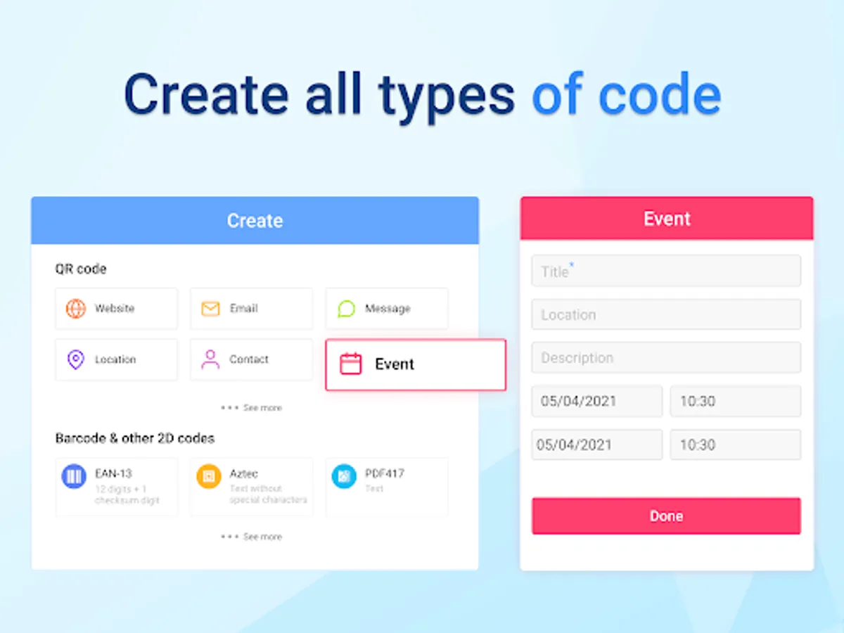 With smart and simple to use barcode scanner, the app is not only a QR code scanner but also helps create many types of barcode generator and QR code maker such as URL, text, contact, event, email, SMS, telephone, location, wifi, data matrix, Aztec, EAN 8 - 13, UPC E - A, Code 39 - 93 - 128, codebar.