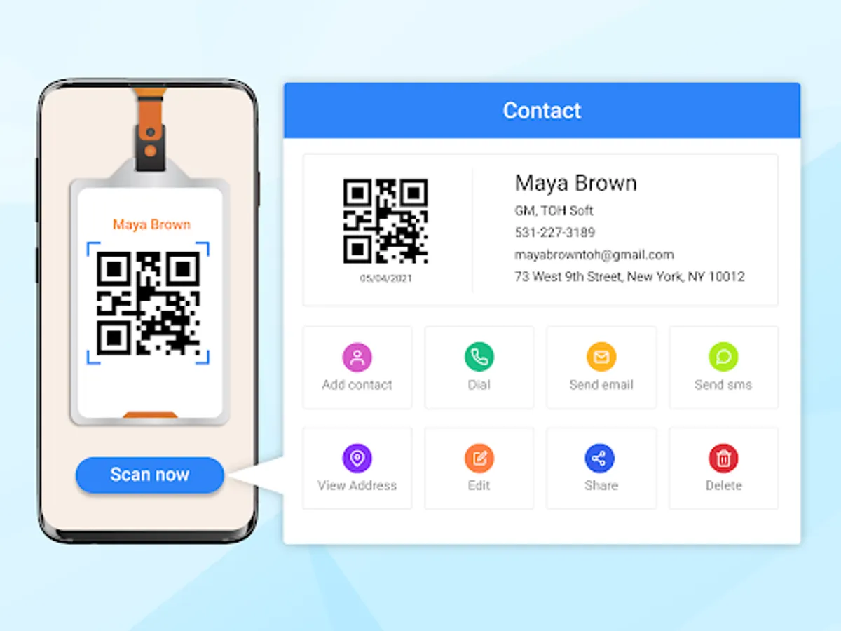⭐️ Scan free QR code and read contact information with QR scanner options as call, email, add to contact and share!