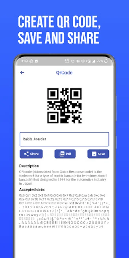 No need to download multiple apps to create and save QR Codes. With this product barcode scanner and QR Code generator, you can create, save and share as many Quick response Code and Barcode entries as you like. Scan QR and share any code in the form of a PDF. Enable your phone’s camera to access the QR Code scanner app, so you can directly fetch information from any QR Code in front of you.