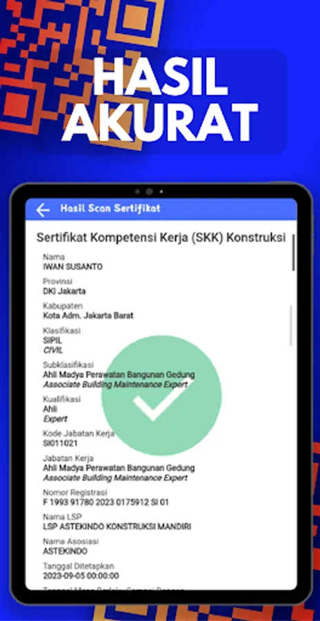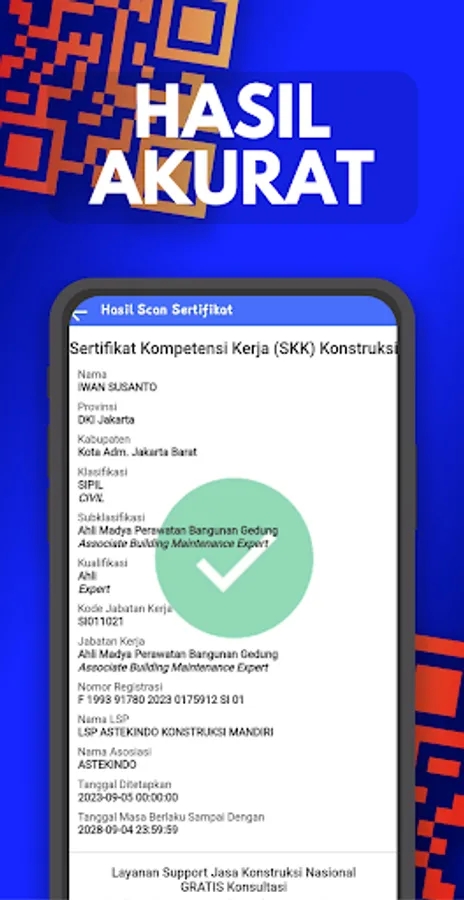 Keabsahan Instan: Aplikasi akan memberikan hasil verifikasi instan tentang keabsahan SBU atau SKK yang Anda pindai.