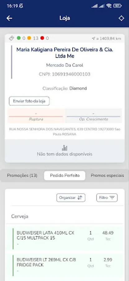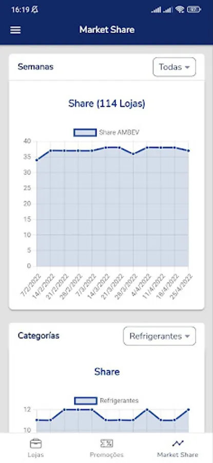 Once the desired route has been created, users can consult detailed information about a store: MarketShare, Out of Stock, Promotions and more. In addition to completing surveys associated with the Site.