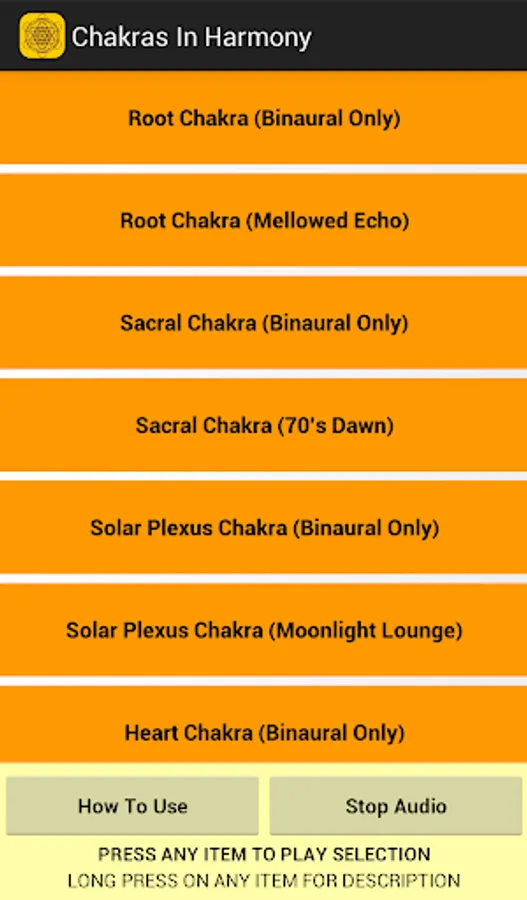 The application comes with 16 selections, with individual chakras targeted in each selection: