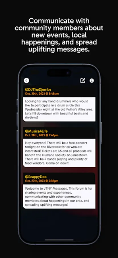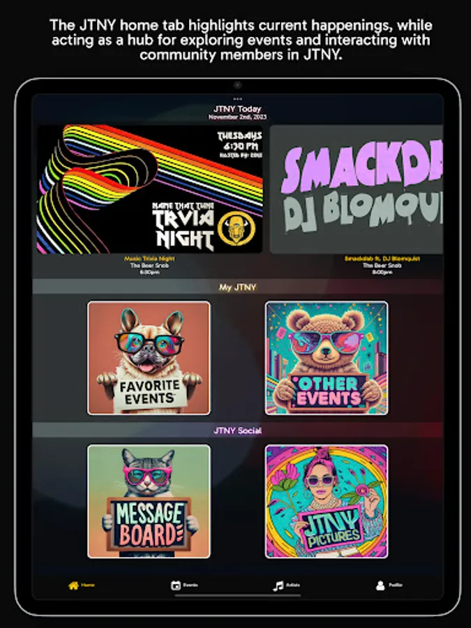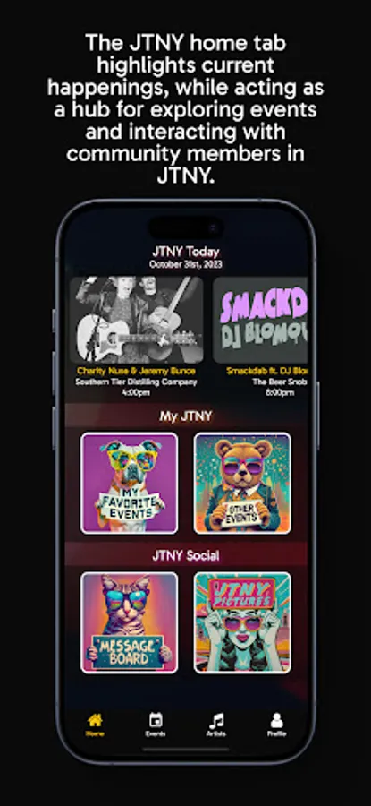 JTNY is a community driven app that focuses on events happening around the Pearl City, Jamestown NY. Browse events, explore local artists, share pictures, and communicate with other community members about local happenings. You can also personalize your experience with favorite events and submit your photos to the JTNY community gallery. As an event organizer, you can sign up to submit your events to the JTNY database.