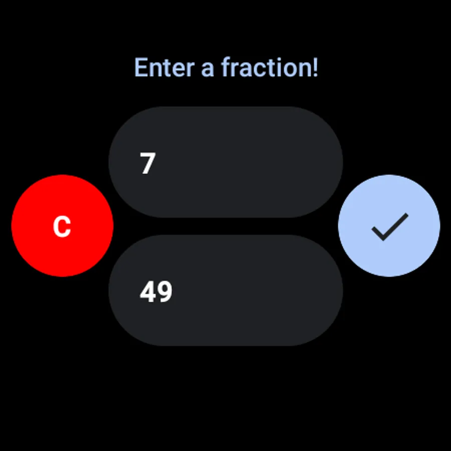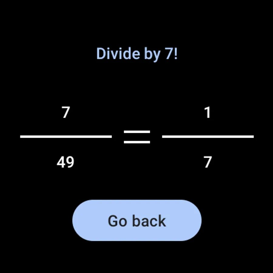 Don't know how to simplify 7/49 in your head. Use Simplify Fractions for Wear OS to find out! The app will not only tell you that 7/49 = 1/7, but also how it arrives at that answer. In this case, dividing 7 by 7 and 49 by 7 gets you 1/7.