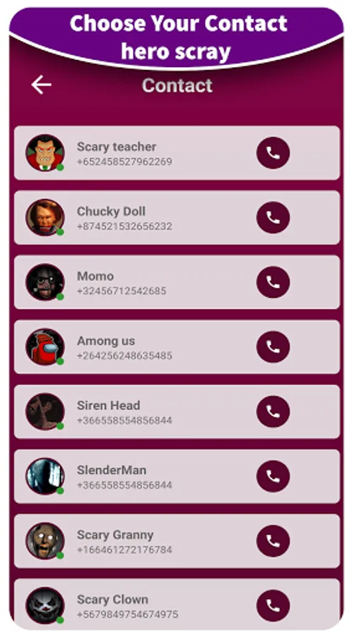 and check your contacts to compos numbers of the hero or the scary creepy or scary Chucky doll and Siren Head calling.