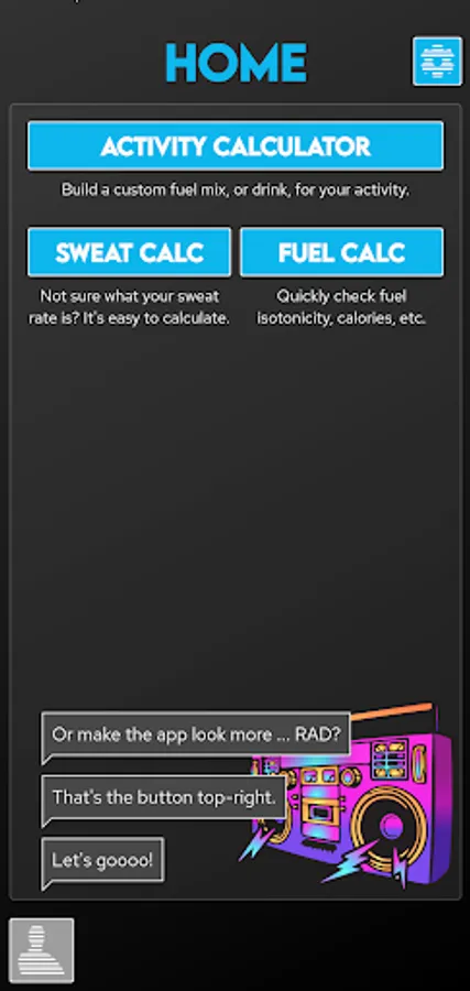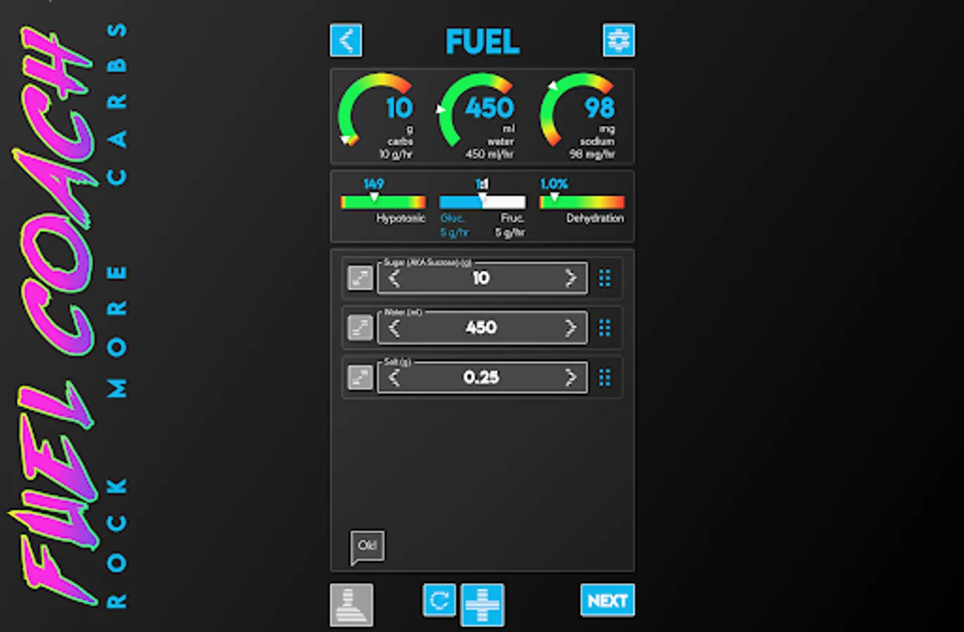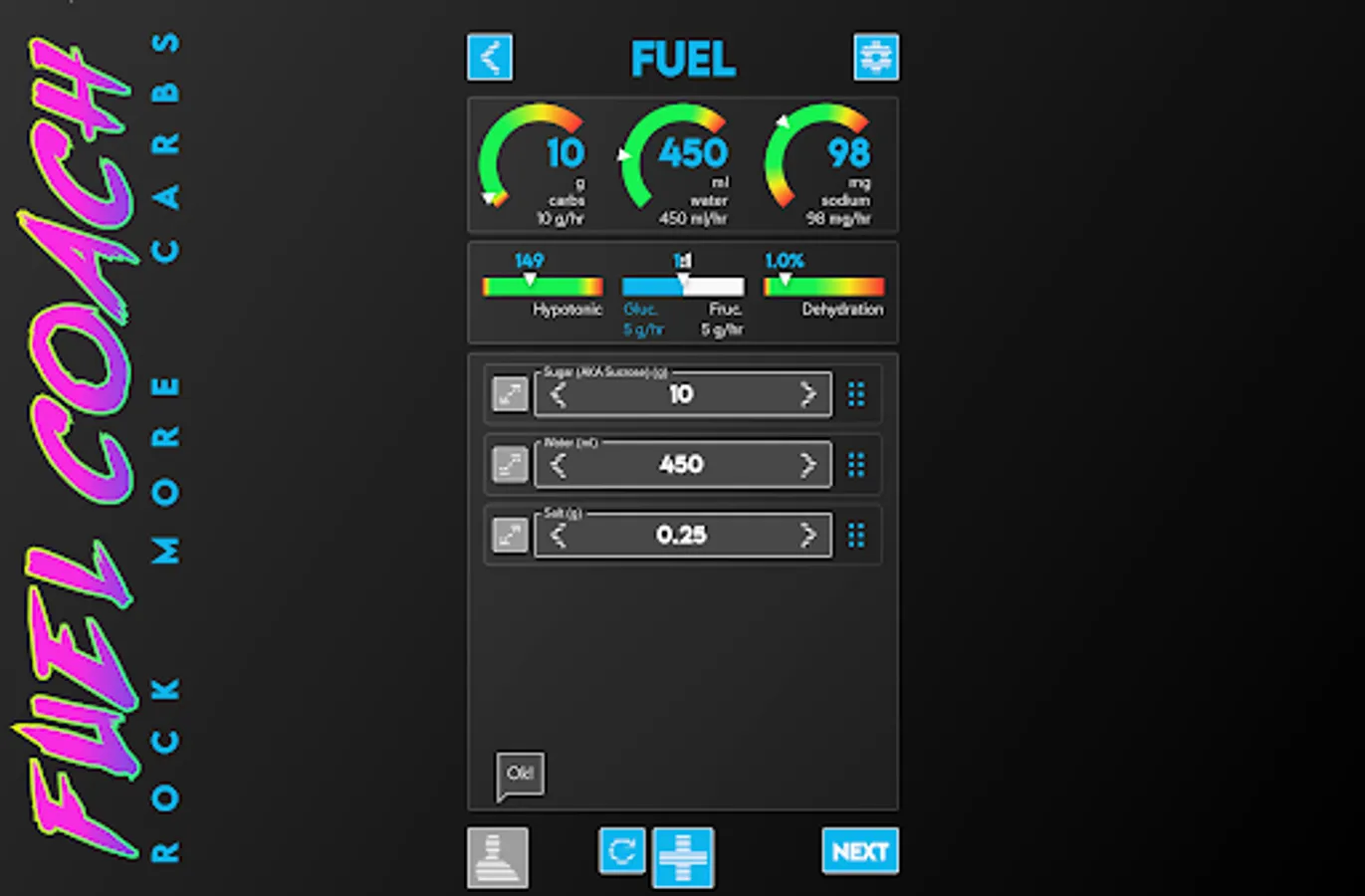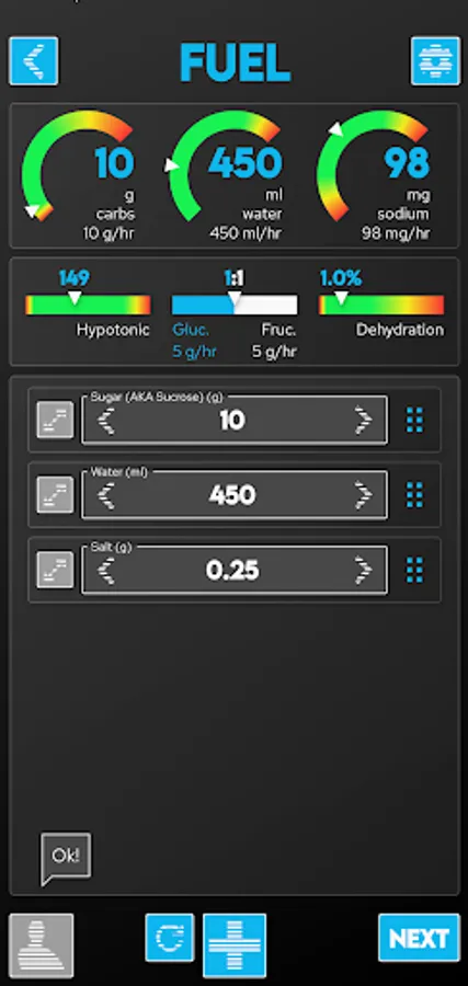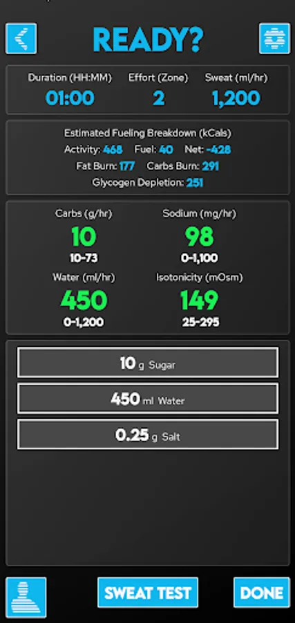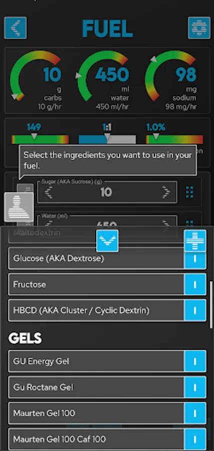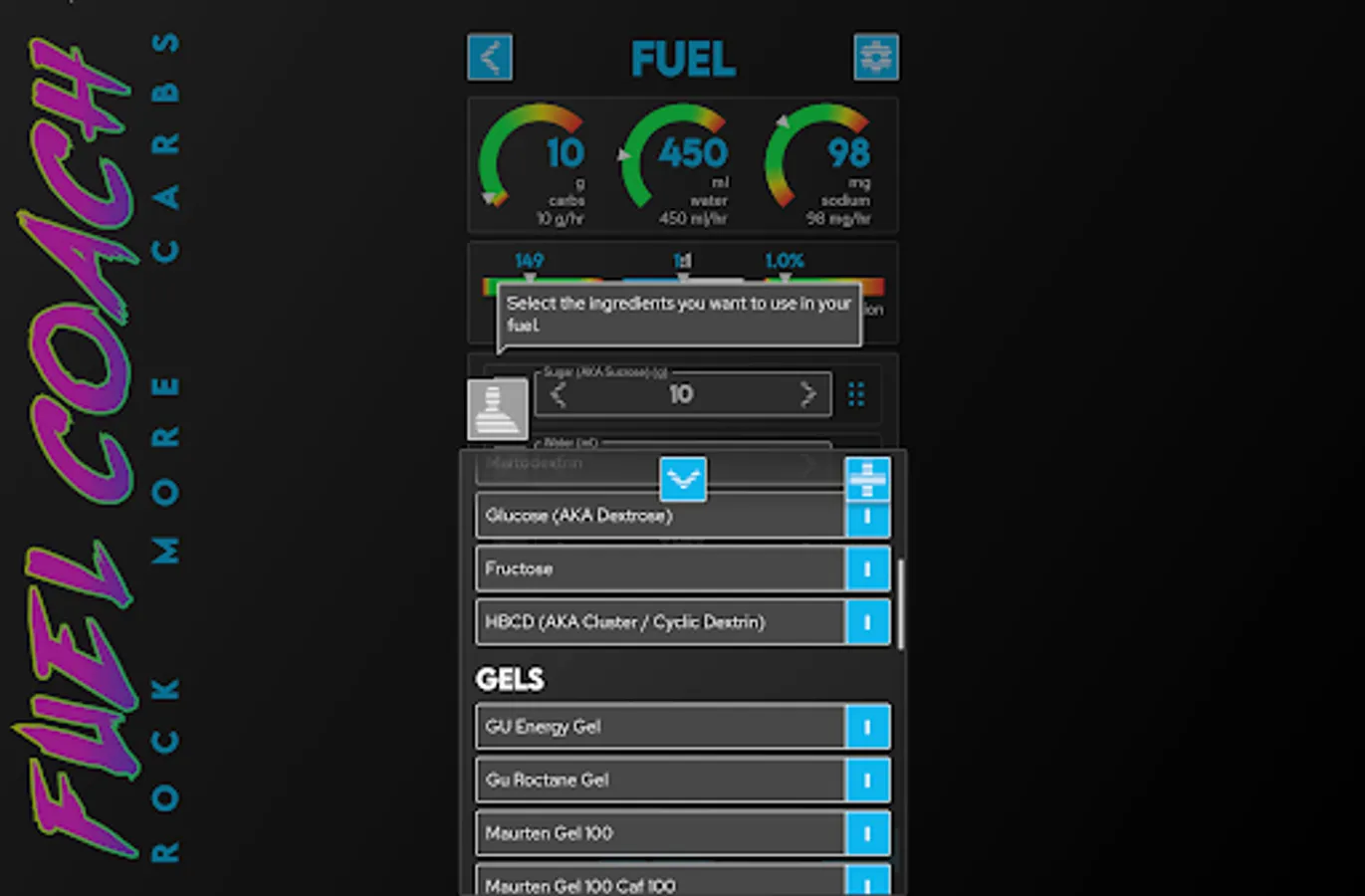 Once you've calculated nutritional needs the app will guide you through building fuel to meet those requirements using commercial gels and powders ... or from salt, sugar, water from your kitchen!