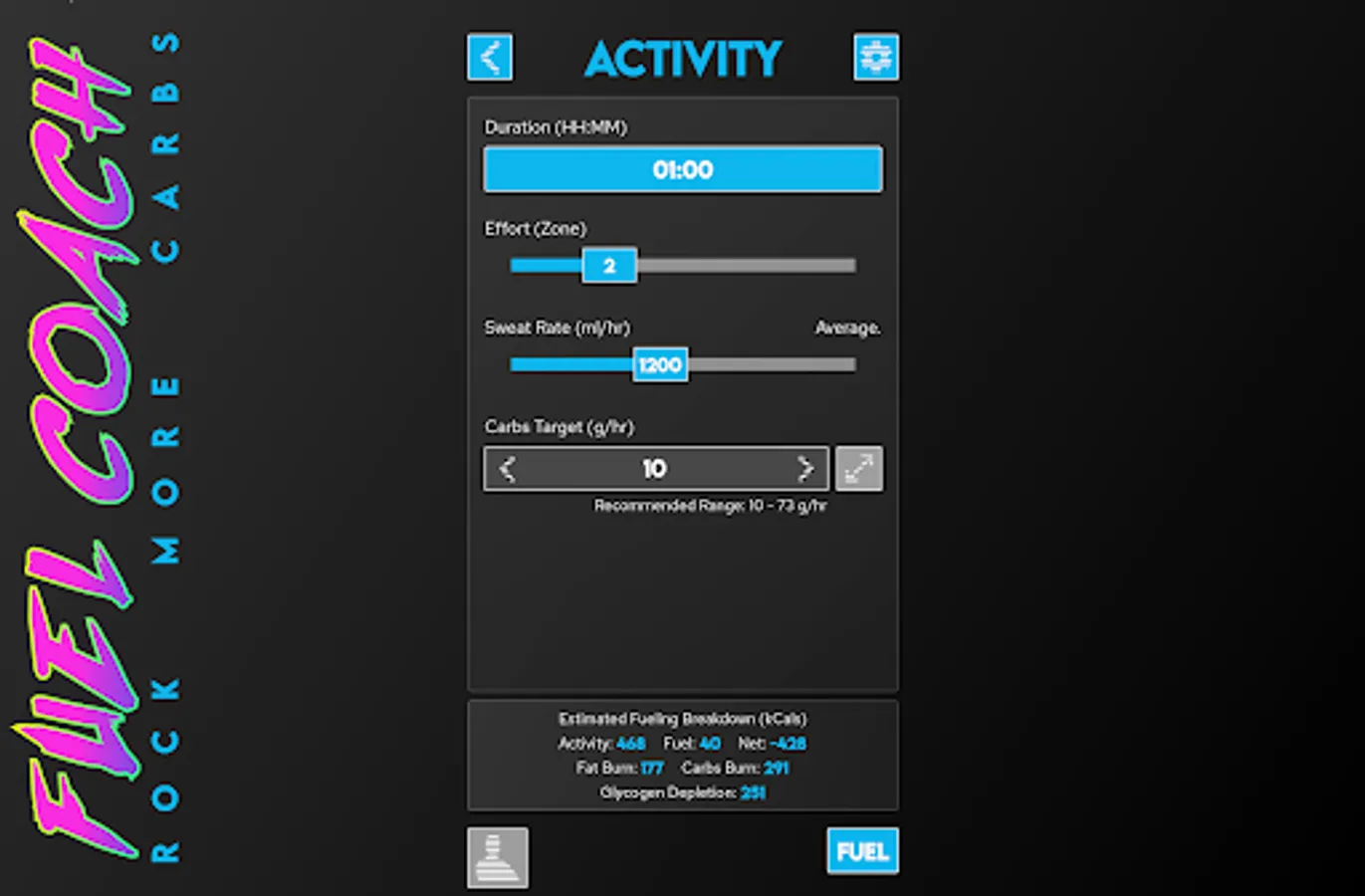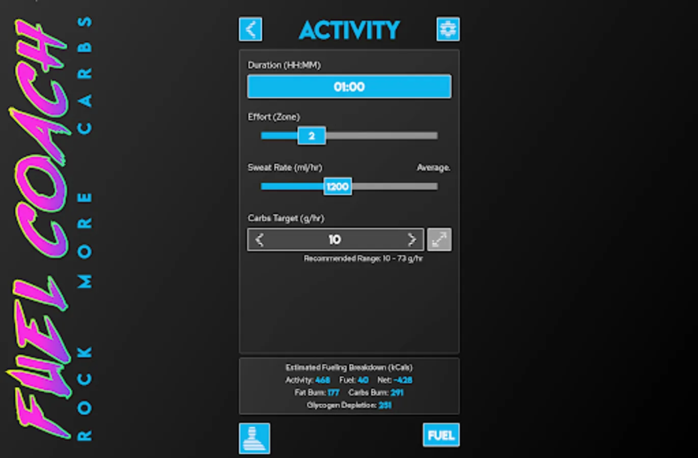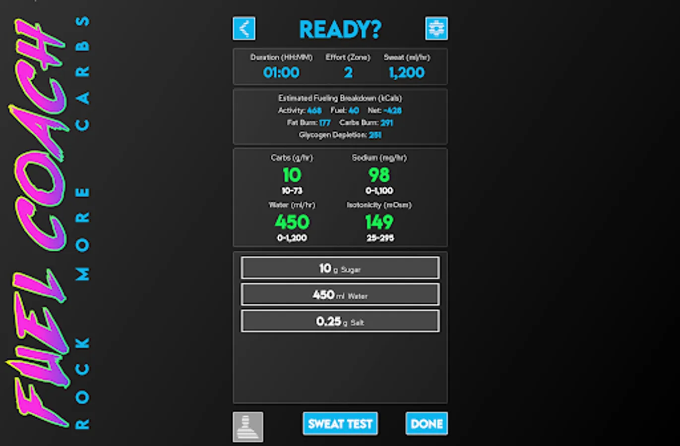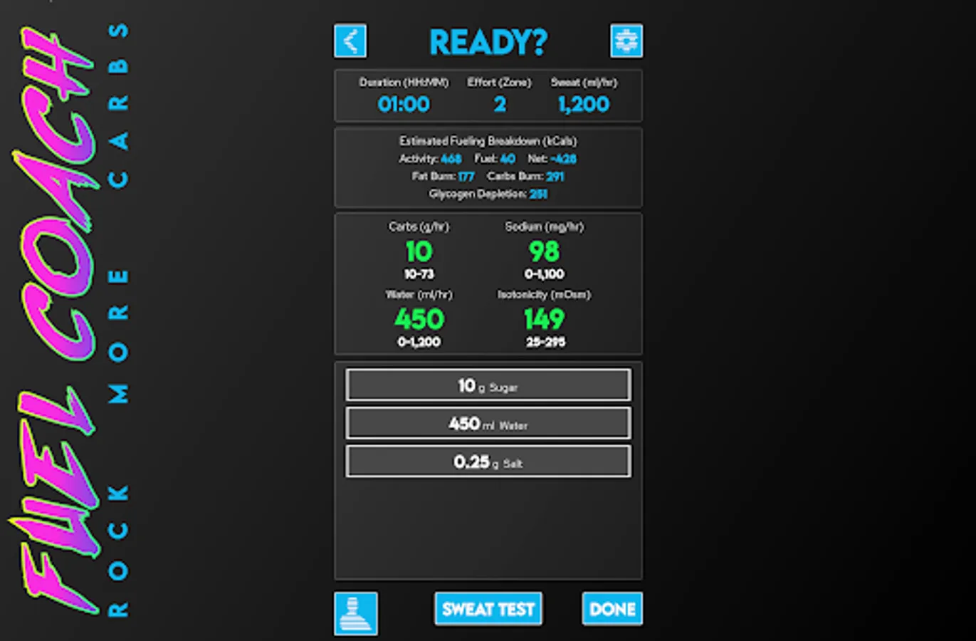 Powered by research from the worlds leading sports scientists, Fuel Coach calculates your individual requirements for carbohydrates, water, and sodium. Tailored to your sweat rate, sodium loss rate, athletic ability, and activity details, these scientifically-backed guidelines will help maximize your athletic performance to reach your full potential.