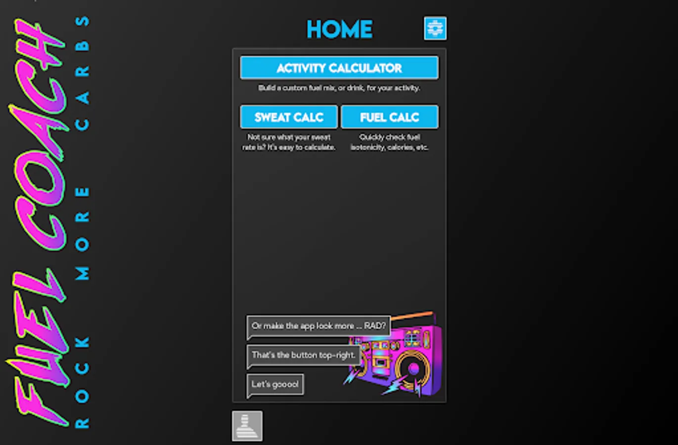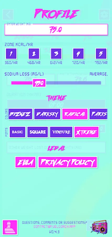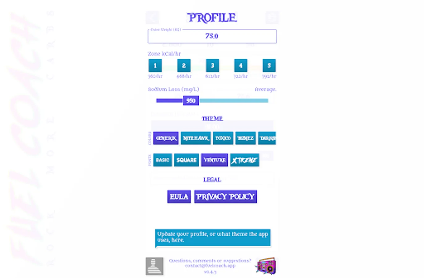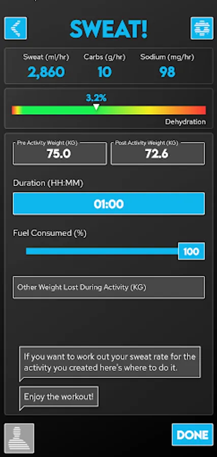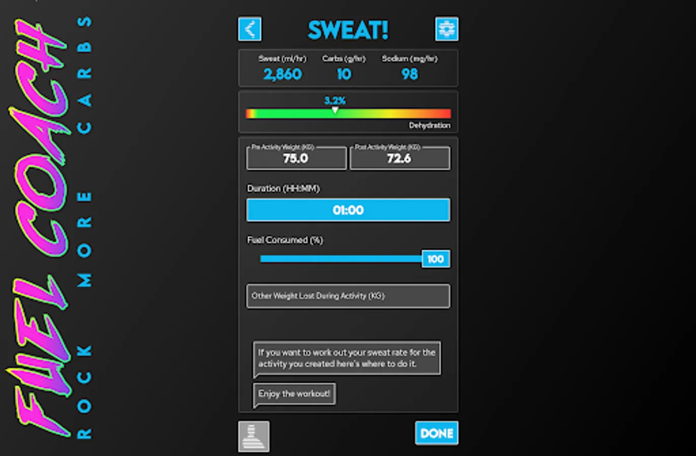 Powered by research from the worlds leading sports scientists, Fuel Coach calculates your individual requirements for carbohydrates, water, and sodium. Tailored to your sweat rate, sodium loss rate, athletic ability, and activity details, these scientifically-backed guidelines will help maximize your athletic performance to reach your full potential.