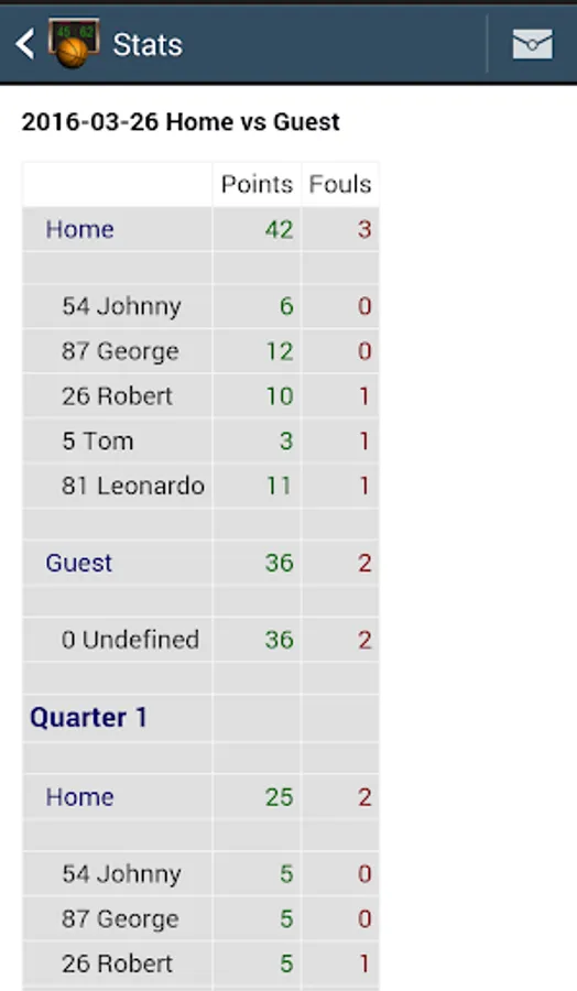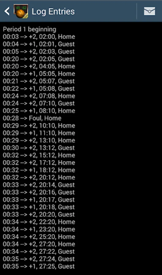 Each time points are scored, a log records timestamp, points, result and the team.