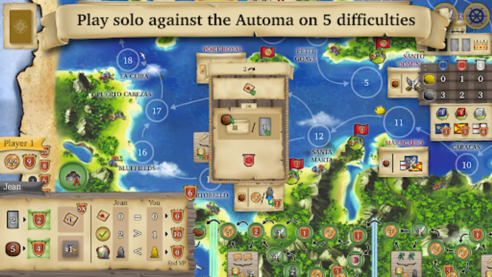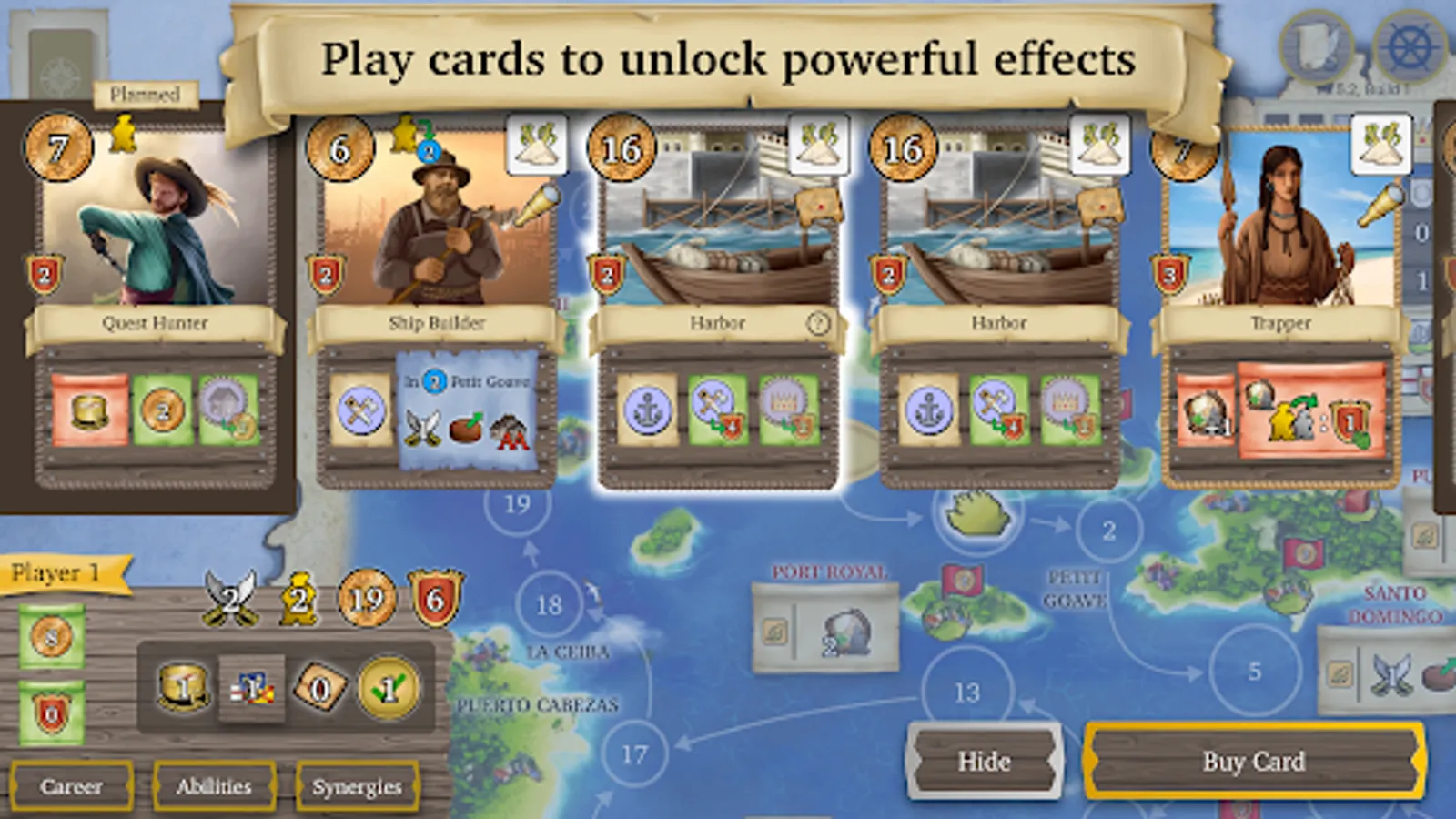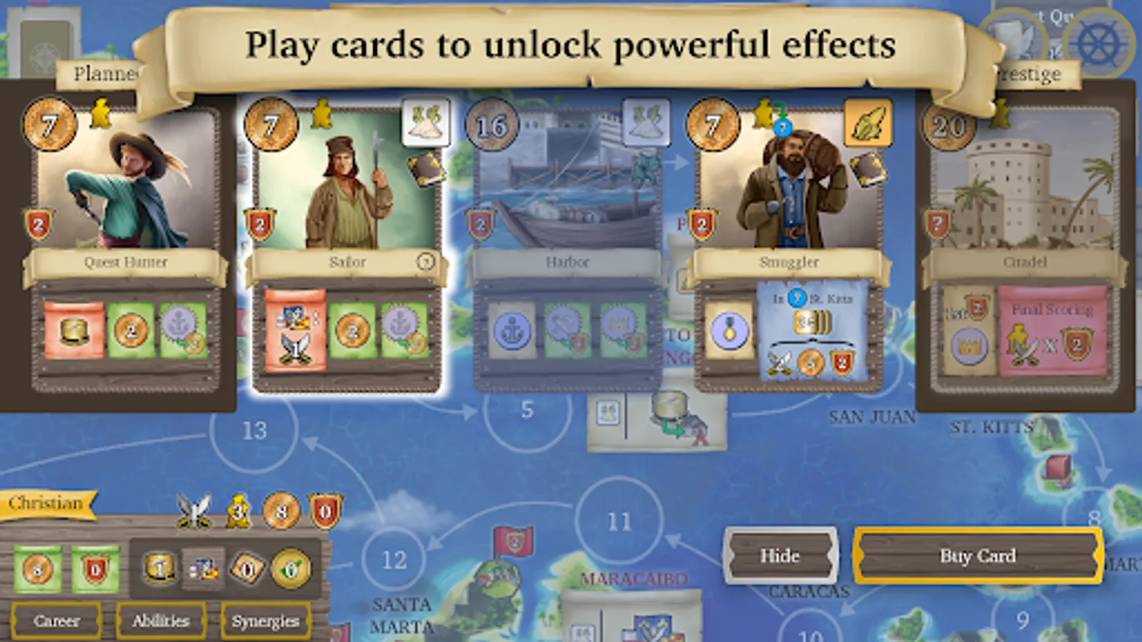 Play as an adventurer and sail around the Caribbean! Upgrade your ship, complete quests, and engage in combat. Every card you buy will unlock new abilities and bonuses to outwit your opponents.