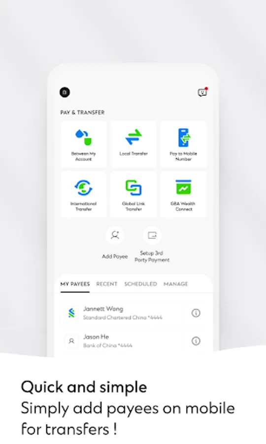 Add Local Transfer & Telegraphic Transfer payee in App directly. Transfer funds instantly between your SC accounts or other accounts by selecting Local Transfer & Telegraphic Transfer and other payment methods.