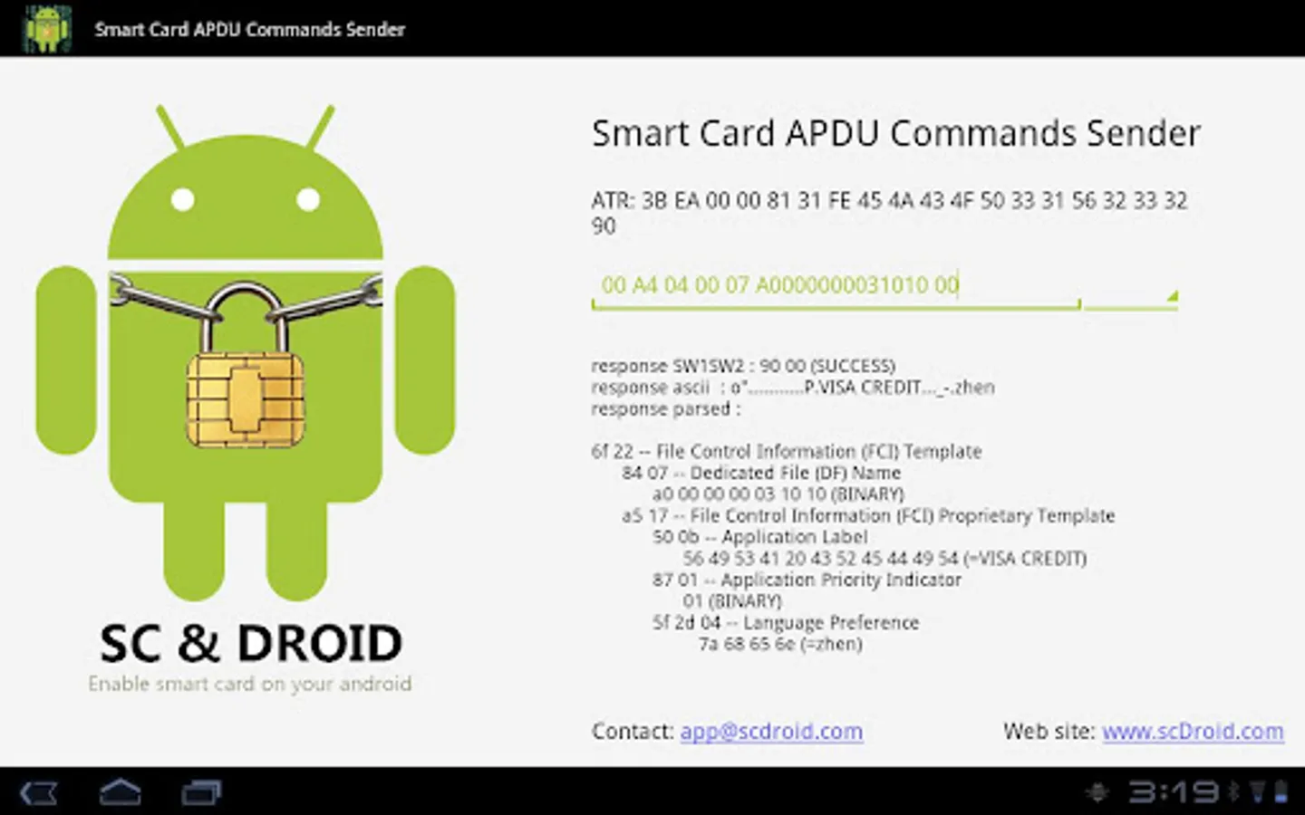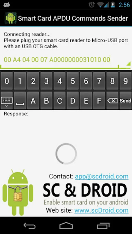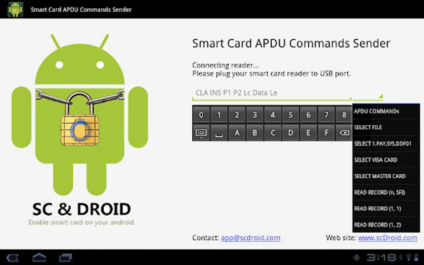This application helps you to connect an USB CCID smart card reader and send APDU commands to get respond from the smart card. If you are a smart card expert, you probably need this kind of tool to test the parameters of APDU commands. If you are a smart card beginner, don't miss it. It's learning tool to communicate with smart card.