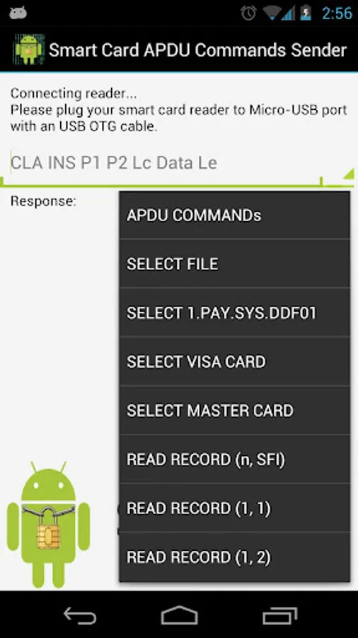 Install the app and plug the smart card reader to android. If your reader supports CCID, a permission dialog popup by android to acquire user's confirmation to access the reader. Click OK to run the app and insert any ISO7816 smart card (should be T=1 or T=0). Select built-in APDU command or input any command you want. Then click "Send" key to transmit the APDU command and show respond on the screen.